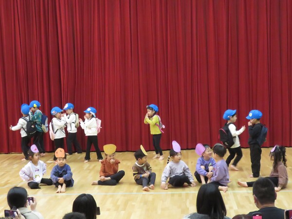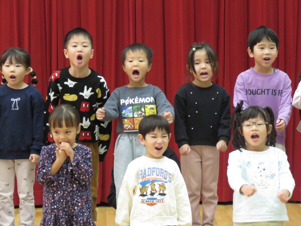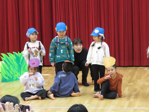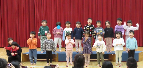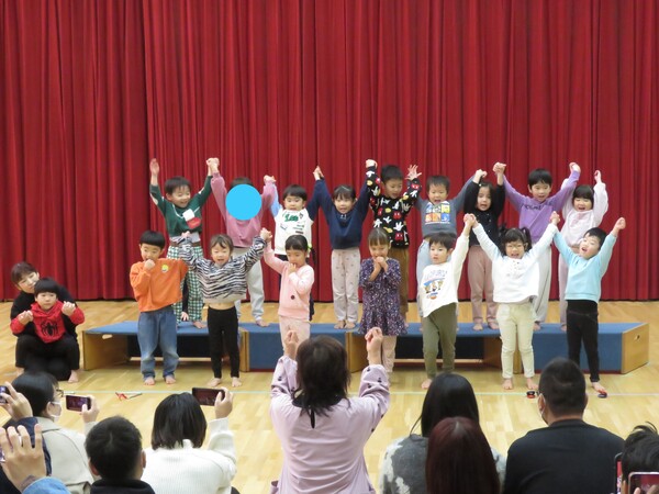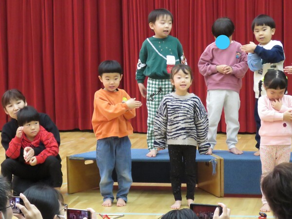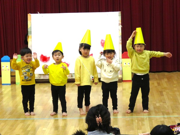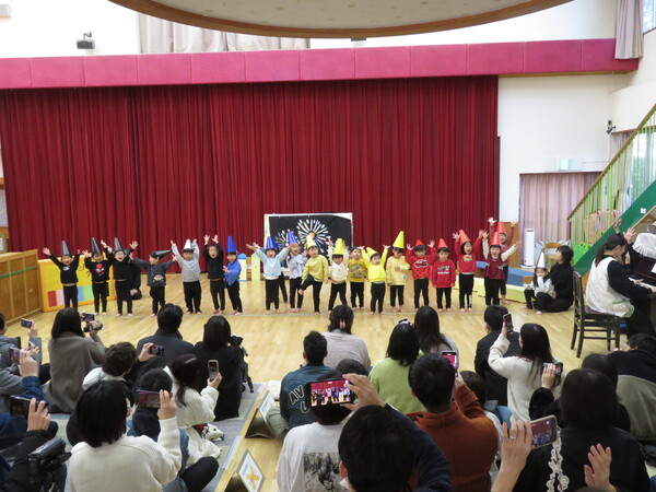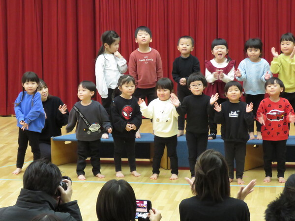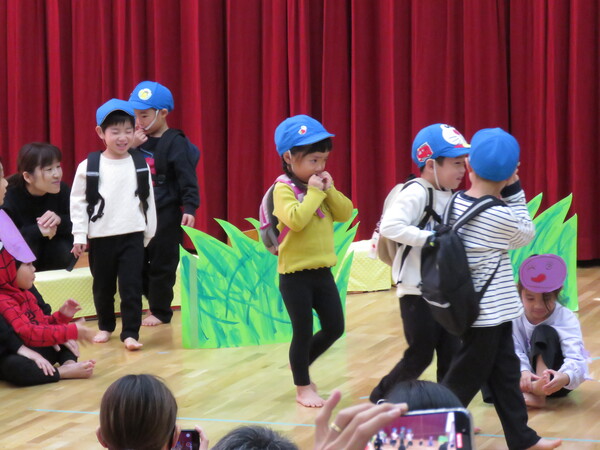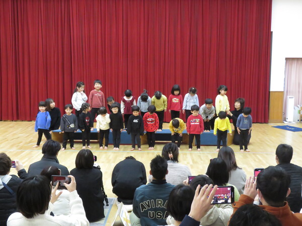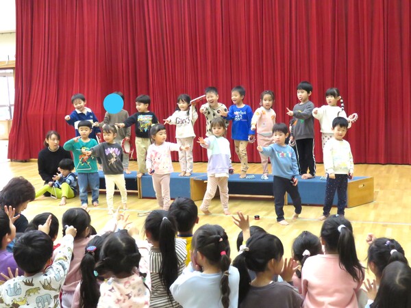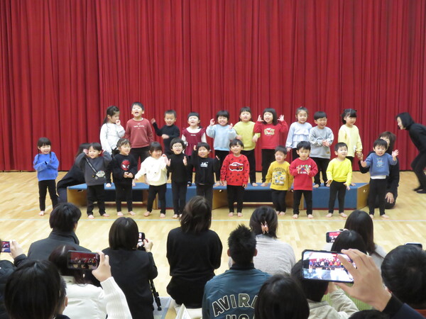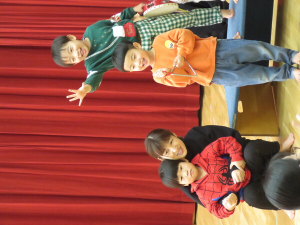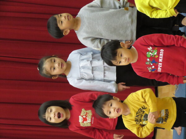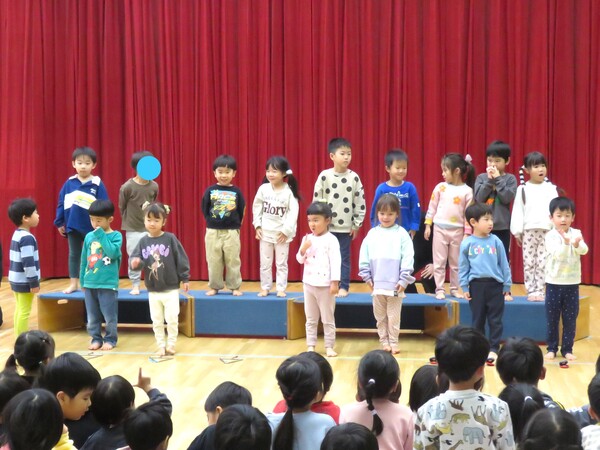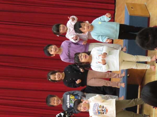 | ふじ組の発表会リハーサルの様子です。 さつき・たんぽぽ組の前で緊張する子、楽しんでる子、はりきっている子www 本番にむけて、がんばりました! |