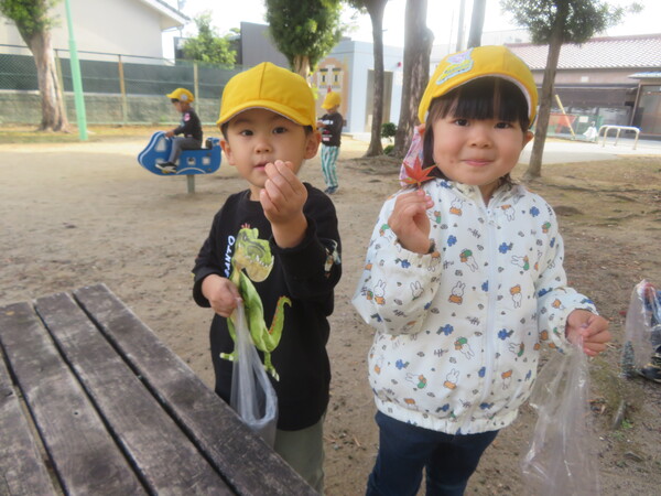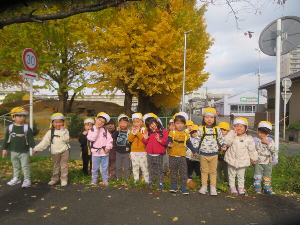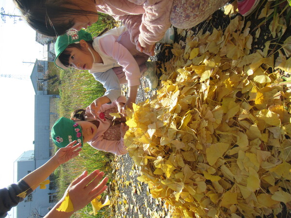 | 一本松公園へでかけた たんぽぽ組。 きいろく染まったイチョウのもとで秋探し。 染まった葉っぱにドングリたくさんw 冬になる前にいっぱい見つけたね! |