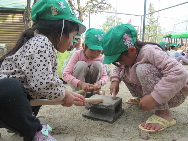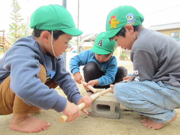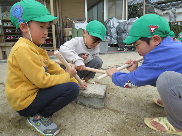 | この時期になると、さつき組は太鼓の練習にむけての準備を始めます。 そのひとつが、太鼓をたたく「バチ」づくりです。 丸木の先をブロックに擦りつけて丸みのある先端に仕上げます。 なかなか根気のいる作業なんです。 |