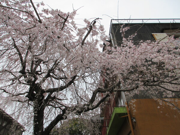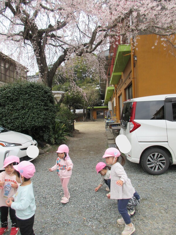 | おとなりの光輝寮の築山の枝垂桜が満開! もも組の頭上にもはらはらと花びらが舞い落ちてきます。 花びらひろって、「ほら見て〜」 お帽子と同じ、きれいなピンク色だね〜 |
