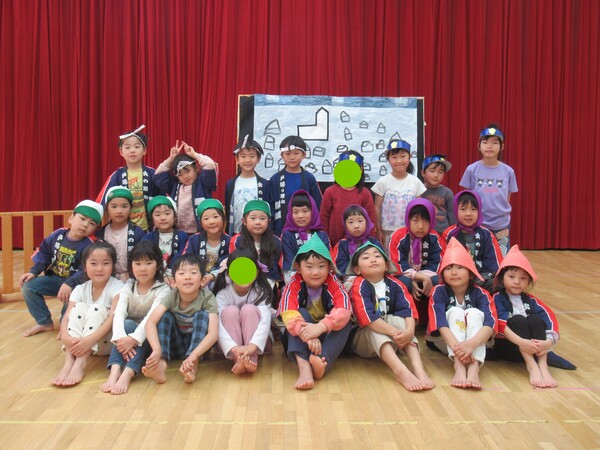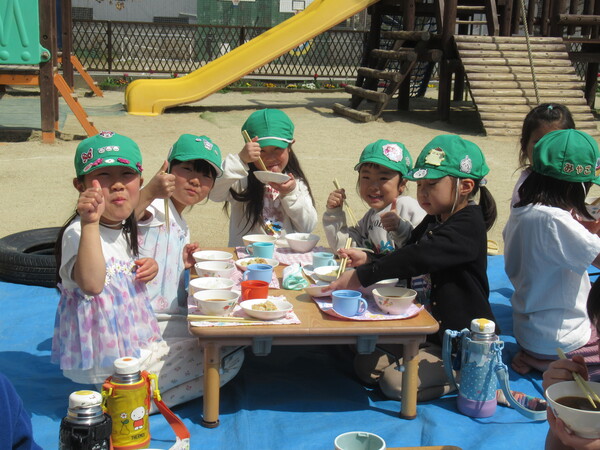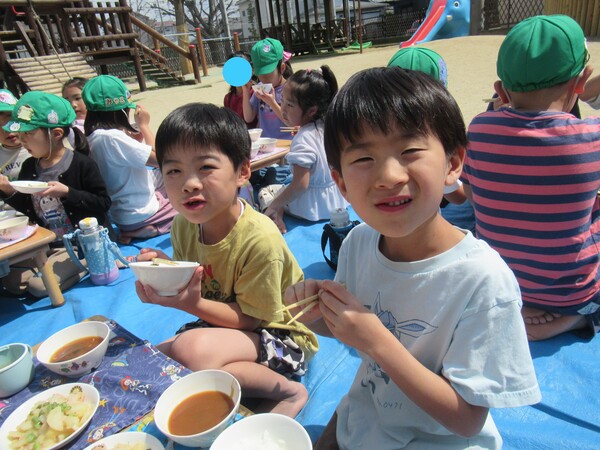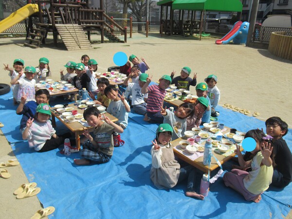 | さつき組が「劇遊び」を録画することに。 撮影後はみんなで記念写真を撮りました。 給食の時間には、劇遊び収録お疲れ〜ということで、園庭で青空給食。 ちょっと何だかお花見宴会気分。 |