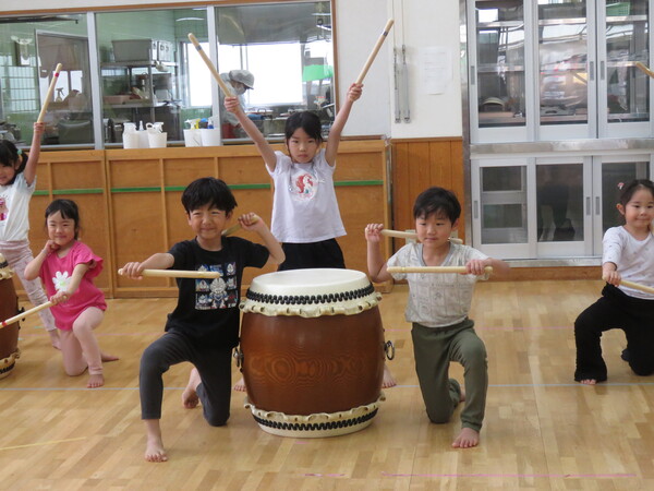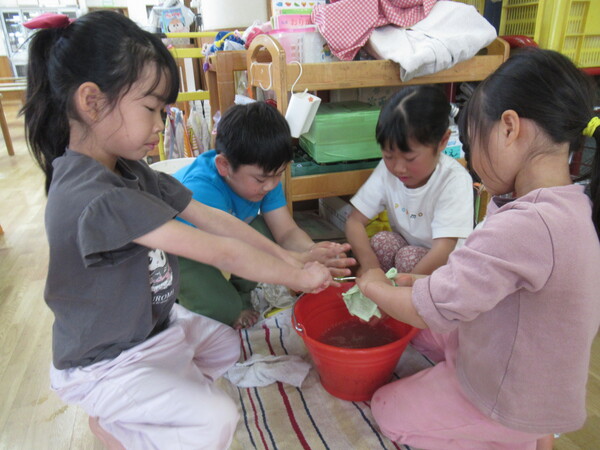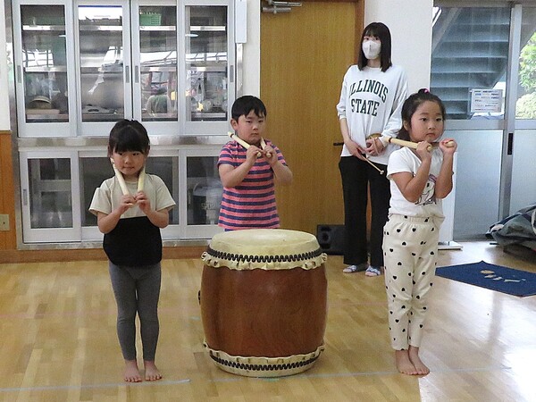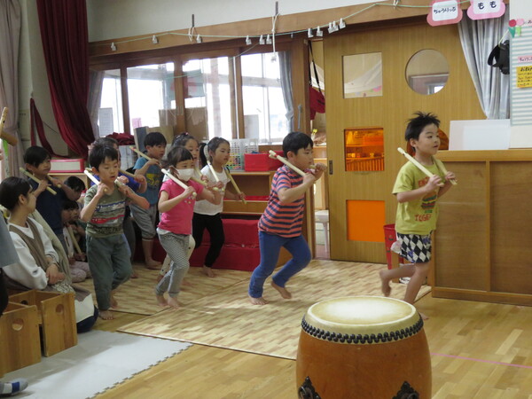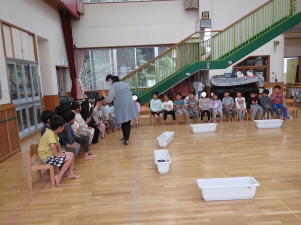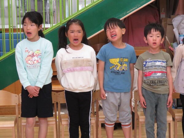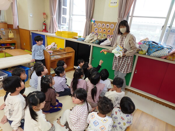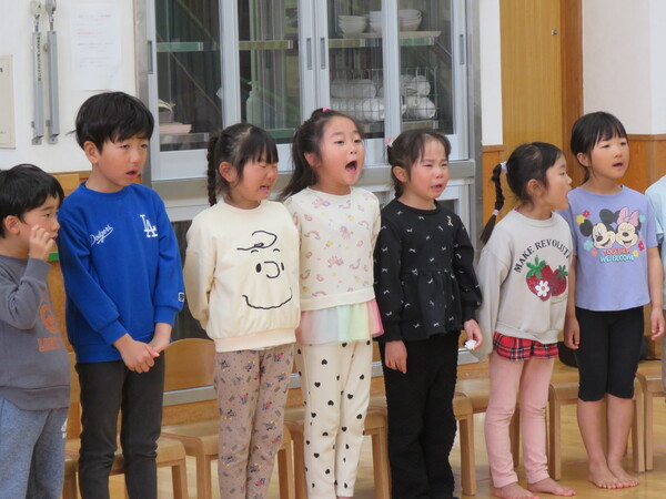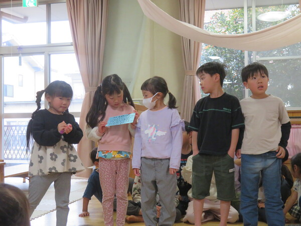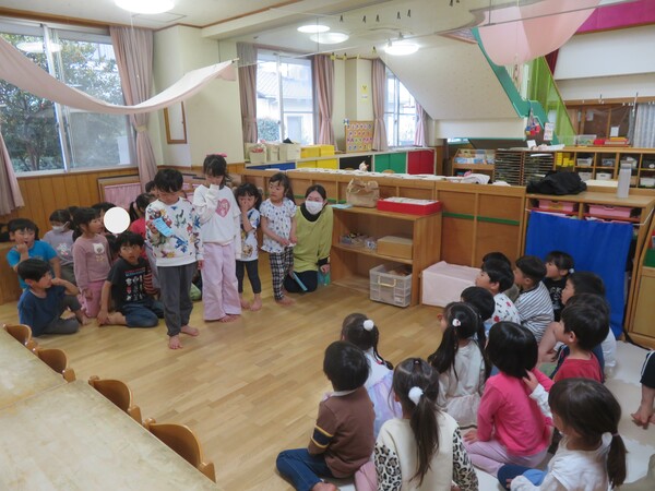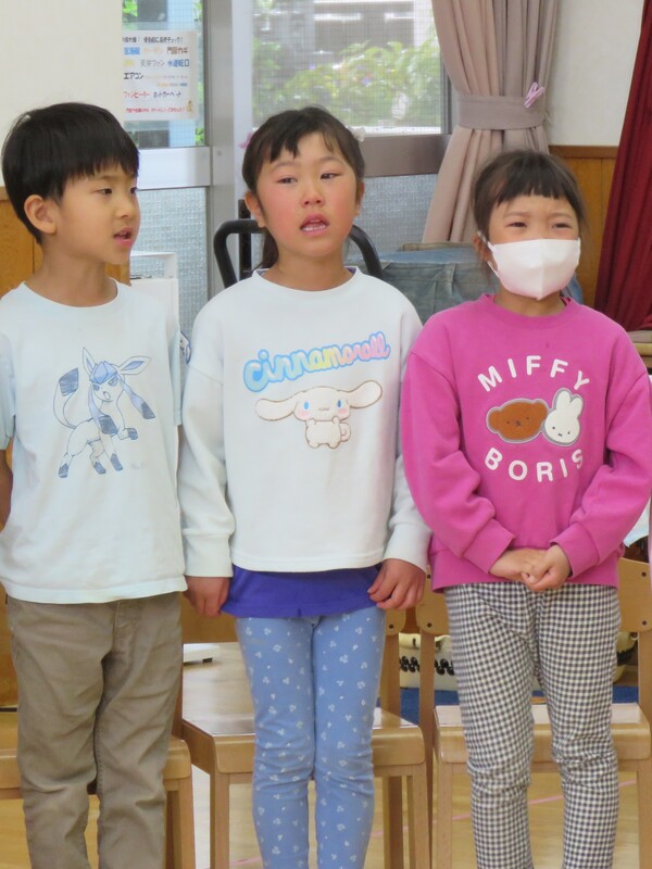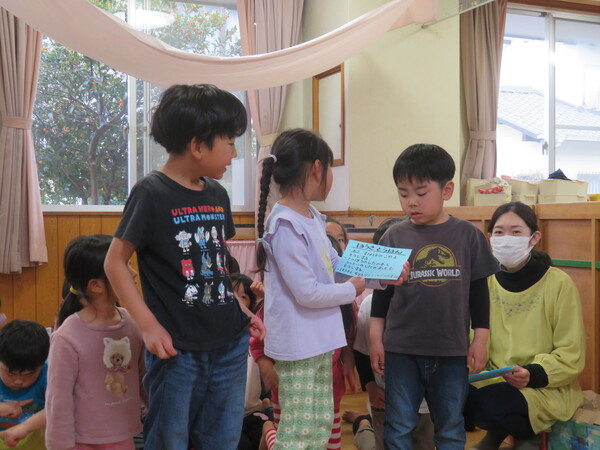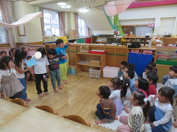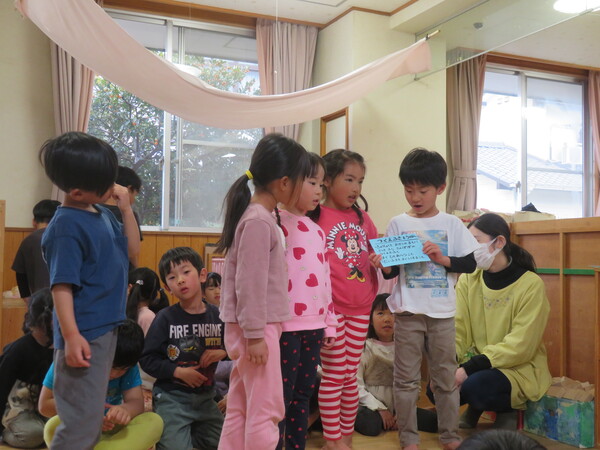 | もうすぐ年長さんになる ふじ組のみんなへ、先輩のさつき組が お当番のことなどを説明してくれました。 「後輩諸君!あとはたのんだよ!」 |