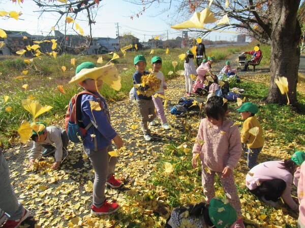 | 12月の佐奈川沿いにでかけた さつき組。 出会ったのは黄色に染まったイチョウの木と降り注いだ落ち葉。 長かった夏の影響で秋が師走までずれ込んだみたいです。 子どもたちにとっては、嬉しい季節外れだったかもwww |