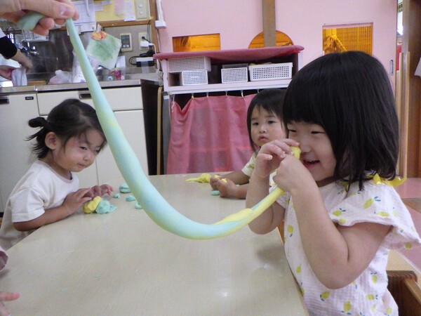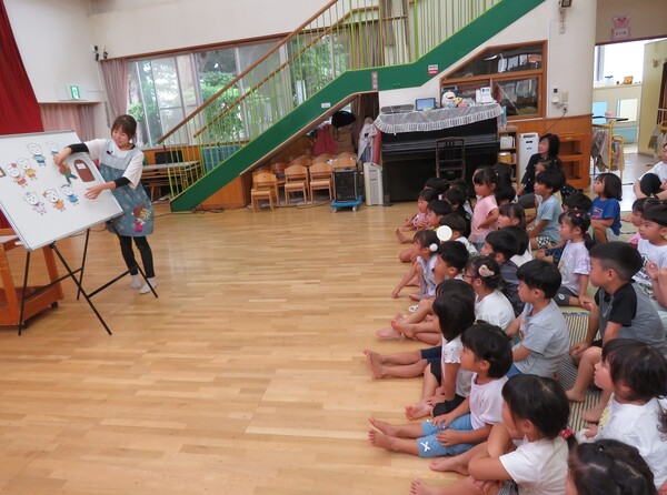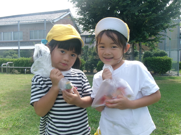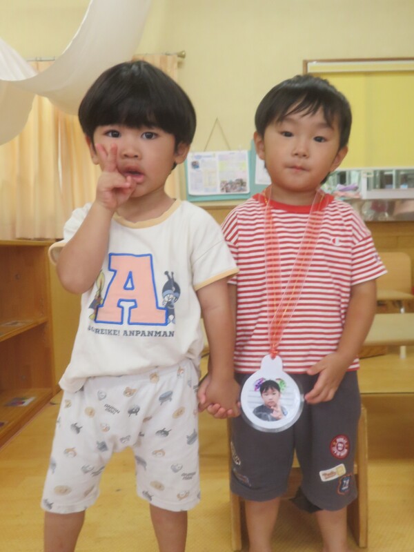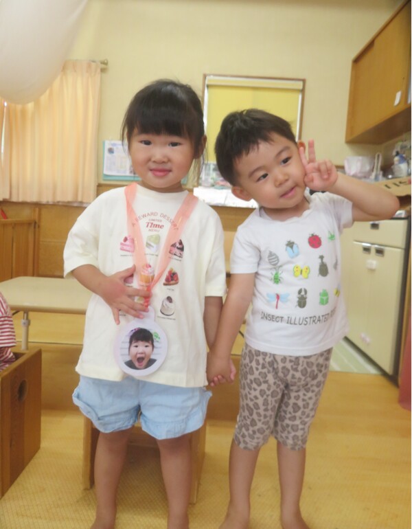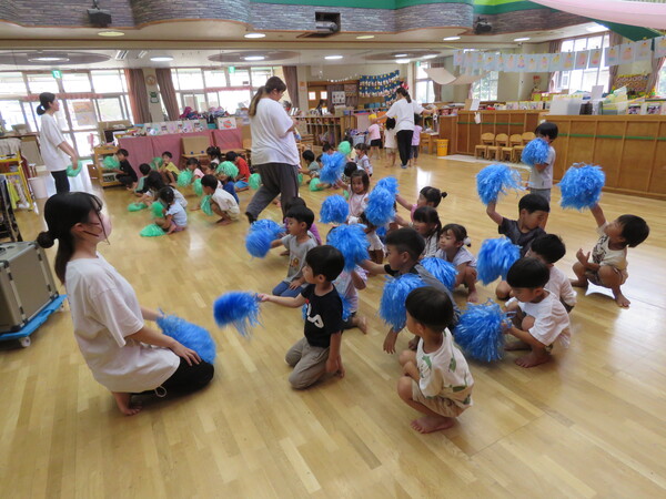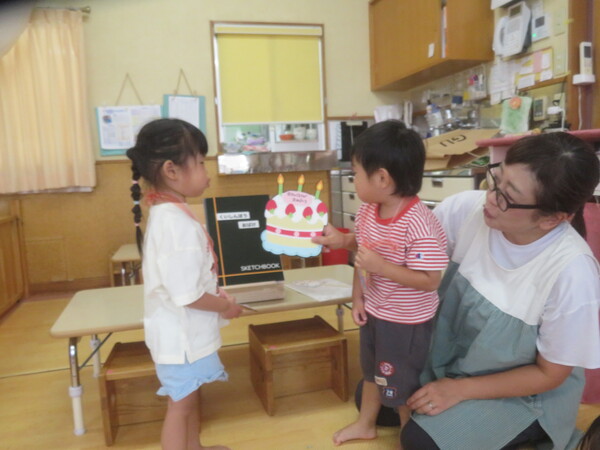 | 9月のお誕生会。 みくちゃんとゆりかちゃんのプレゼントをたっぷり楽しんで、9月生まれのみんなをお祝いしました。みんな、お誕生日おめでとう! |