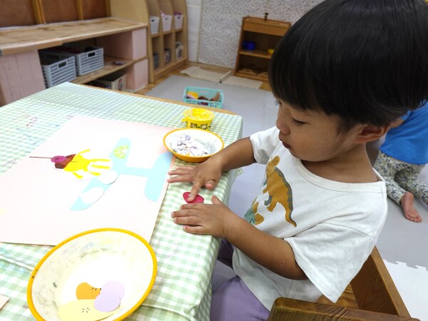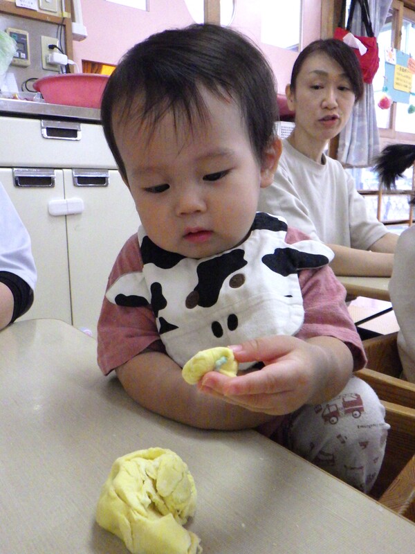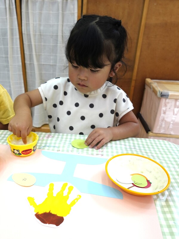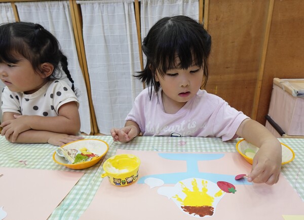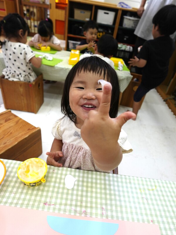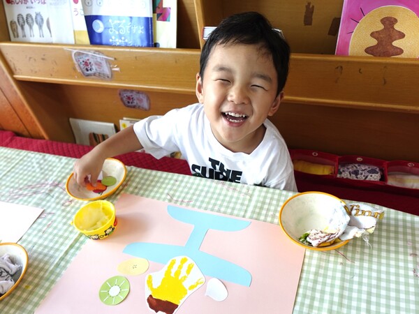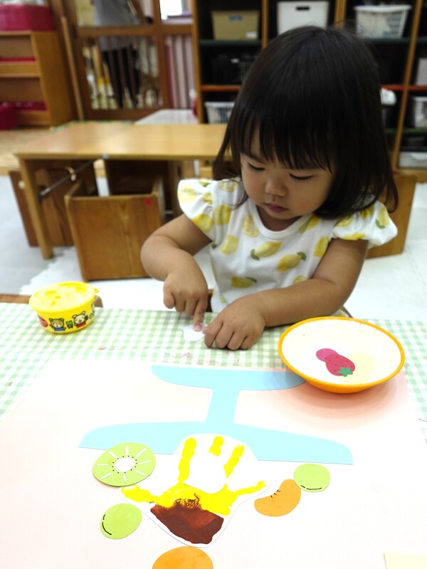 | ちゅうりっぷ組、手形をいかした制作を楽しみました。 作るのは、プリンアラモード! ?プリン・・・ア?モラ?www ちゅうりっぷ組のみんなには、ちょっと難しくて言いにくいみたいwww |