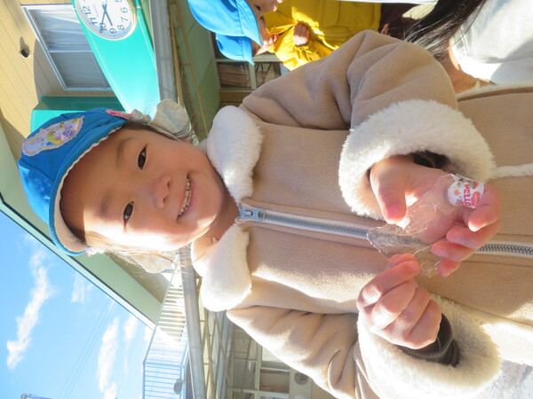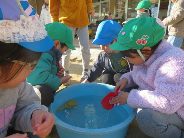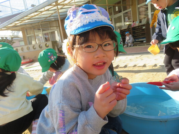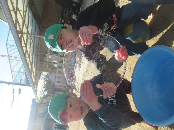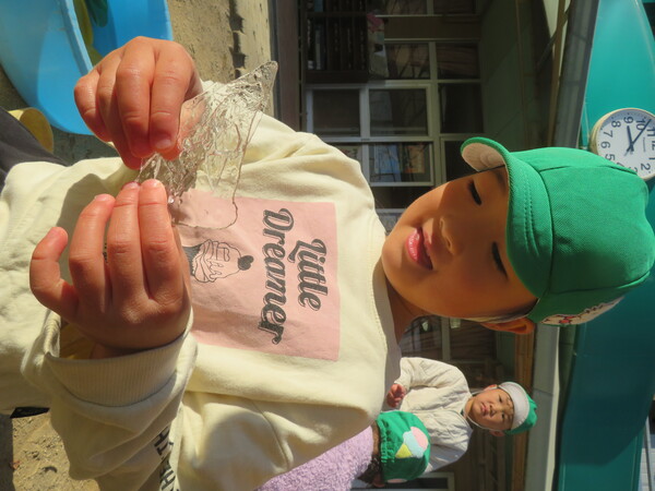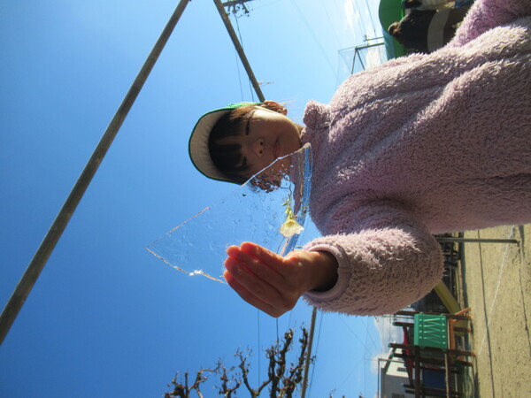 | 最強最長寒波だとか。 ここらへんは雪がチラつく程度でホッとしました。 昨夜、バケツにお水をはって園庭においておいたら、 期待通り 氷が張っていました。 冬の寒さのプレゼントですね |