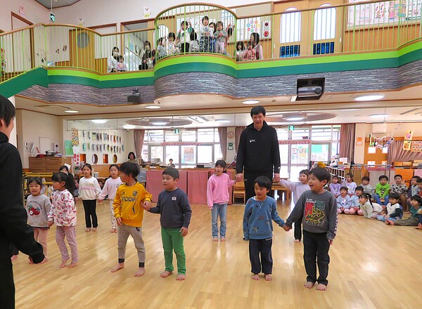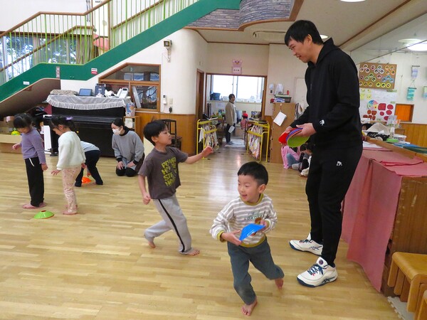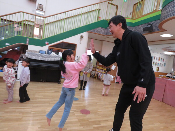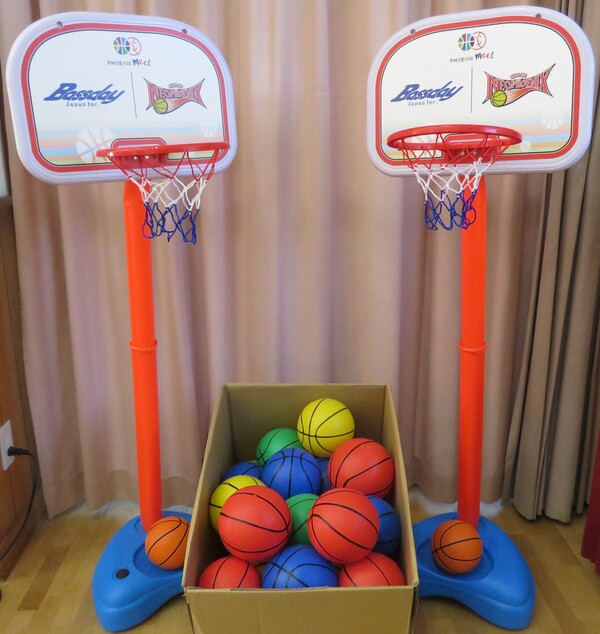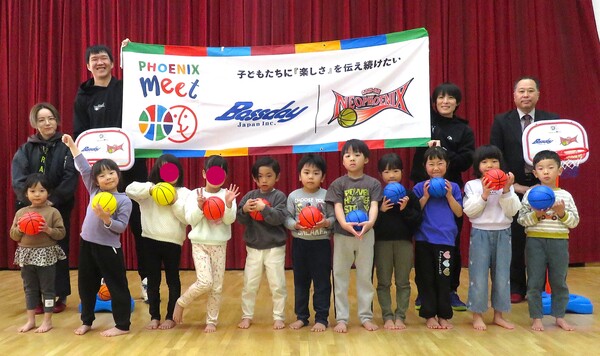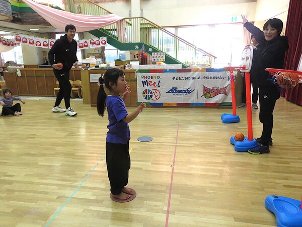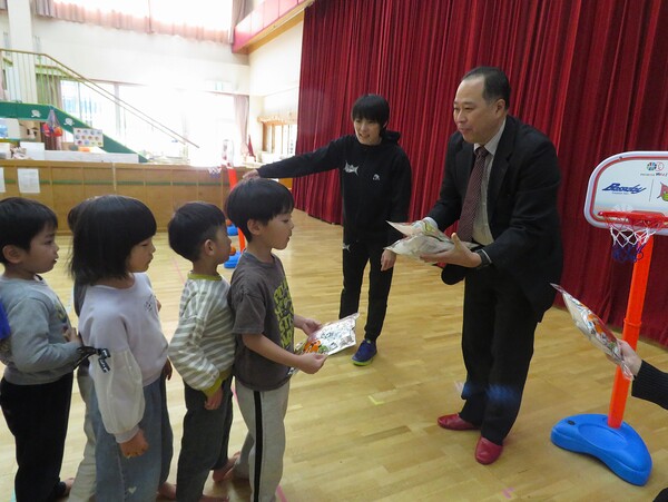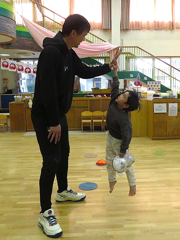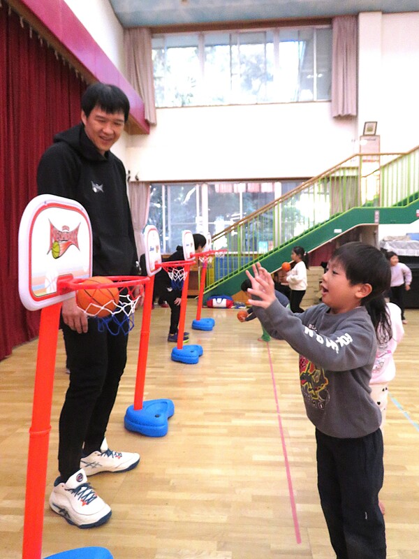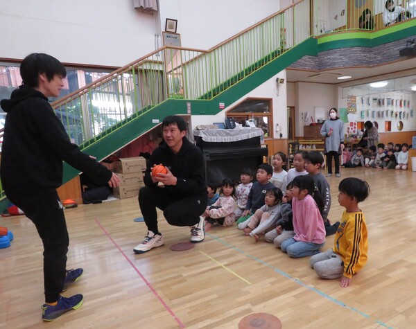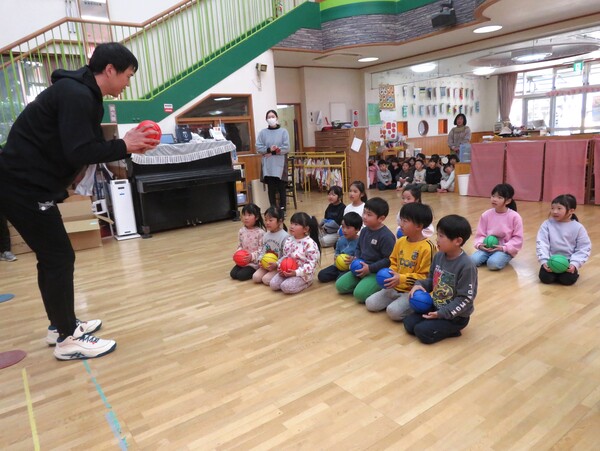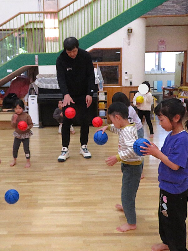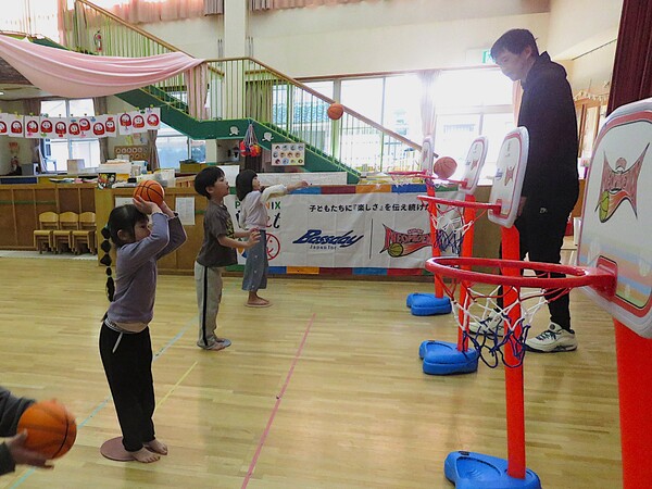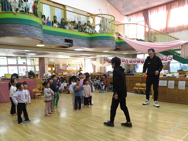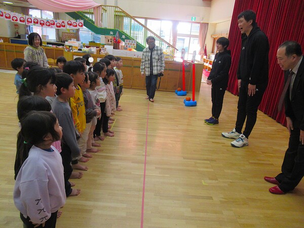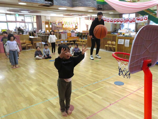 | プロバスケットボールチームの三遠ネオフェニックスとルアー製造・販売のバスデイ・バスデイジャパンの皆様による バスケ用品寄贈企画を賜りました。寄贈にあたり、なんと元日本代表で同チームの スター太田敦也(元)選手と現アカデミーコーチが来園くださり、バスケ交流会を開催していただきました! 名前も背丈もビッグなスターの来園にちょっと緊張しながらも、優しく楽しいバスケ教室を満喫した さつき組。 バスデイジャパン社長の野本様から、綿菓子セットのプレゼントもいただき、素敵な時間を過ごしました。 関係者の皆様、本当にありがとうございました! |