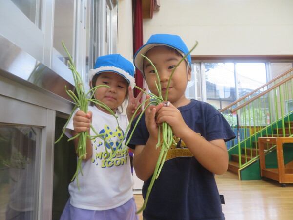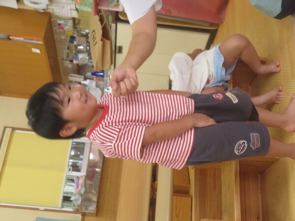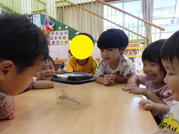 | 今年はトンボの当たり年なんでしょうか。 いろんな種類のトンボがいっぱい飛び交っていたのですが、 大きな大きなオニヤンマが舎内にはいってきてしまいました。 鳥かドローンか!?というくらい、どでかいオニヤンマ! こんな立派なオニヤンマにはなかなか出会えないと思います。 一晩たっても外へ出られず弱ってきてしまったので、 つかまえて、みんなで「すごーい」と楽しませてもらってから、 お外へリリース。 その雄姿をみんなに見せに来てくれたのかなぁwww |