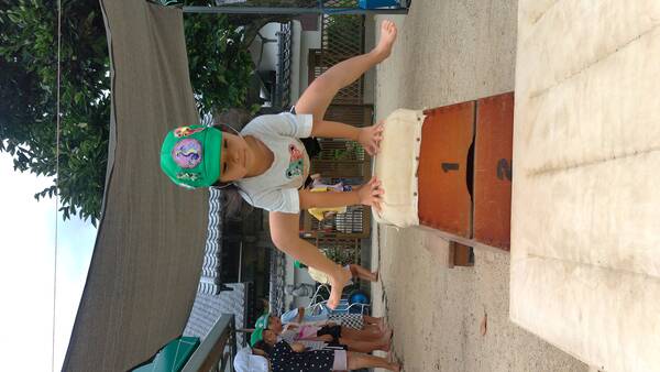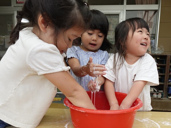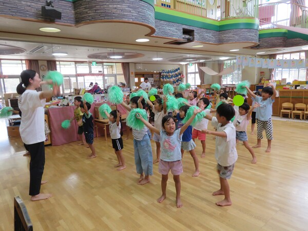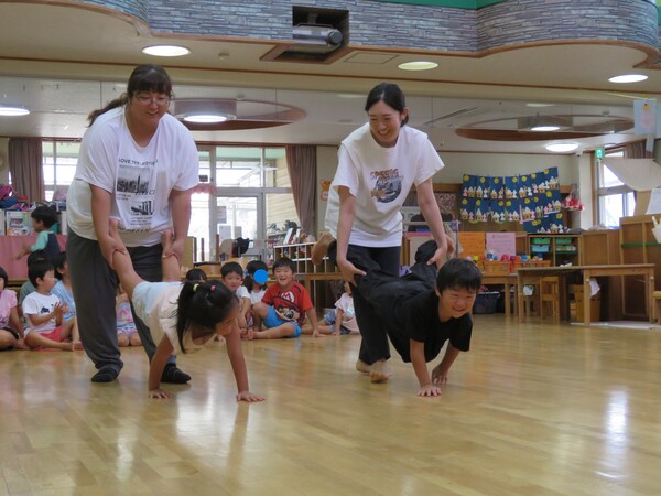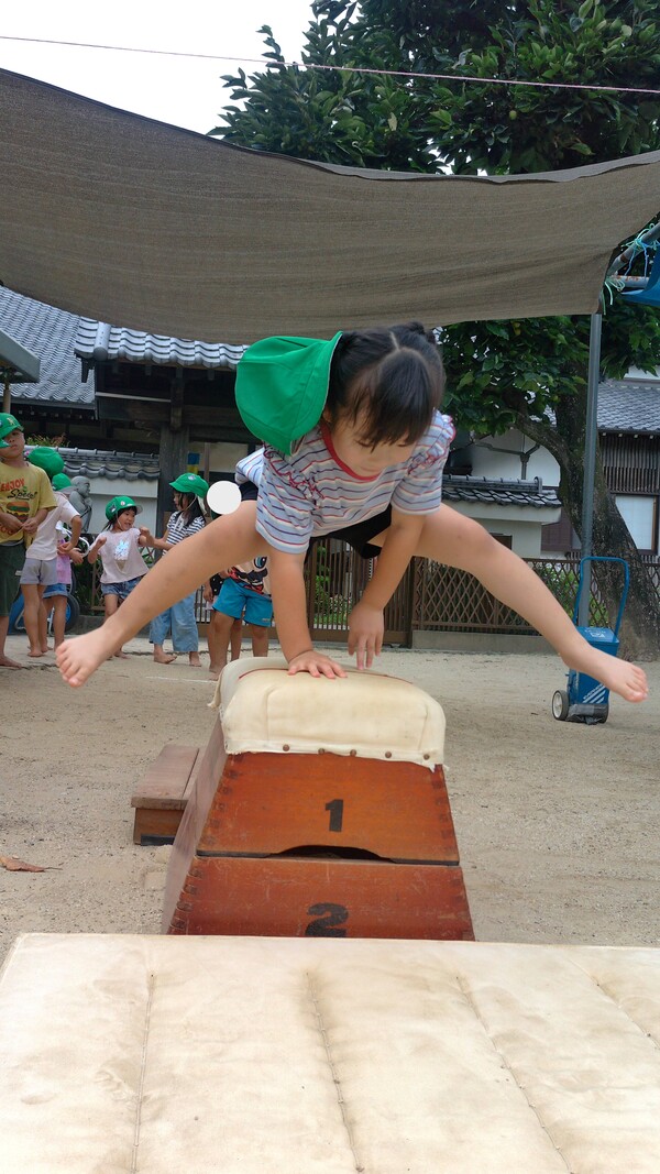 | 雨がふった午前中はホールで運動会OPのダンスや体づくりの遊び。 雨上がりの午後は、外で跳び箱の練習などに励みました。 |