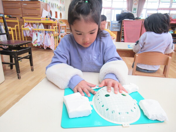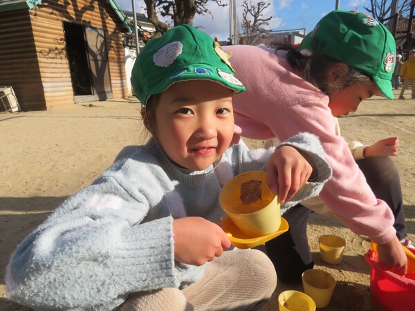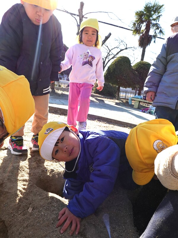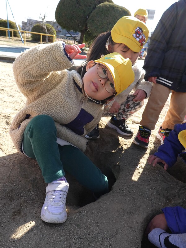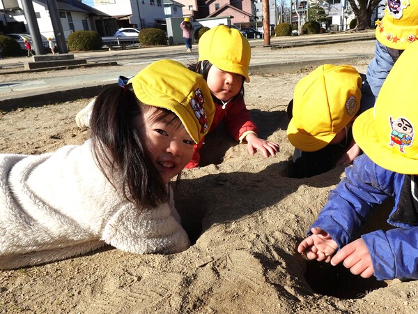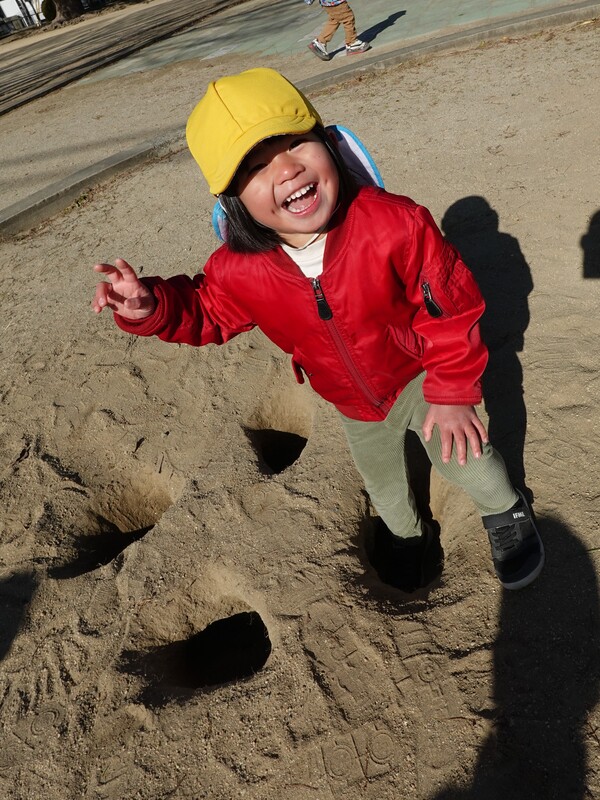 | 冬の金屋橋公園へでかけた たんぽぽ組。 砂場で掘り掘り、掘り下げて、まるで遺跡採掘か、蟻さんかのよう!? 3歳児にして、そんな技術をお持ちなんですねw |