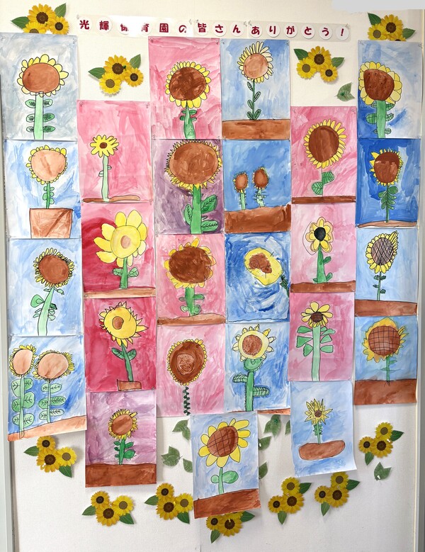 | さつき組の描いた「ひまわり」の絵が豊川南大通郵便局さんのロビーにて展示されています。 「お泊り保育の思い出」に続いて、飾っていただきました。 夏枯れして、リトライして植え晩秋に開花した向日葵を描いてくれました。 季節外れではありますが、せっかく描いた素敵な絵を地域のみなさまに披露できないかと 思っていたところ、南大通郵便局長さんから、展示のお話をいただいたところです。 本当にありがとうございます。 地域のみなさまが作品をみて、とても喜んでいただけるとのことでした! |