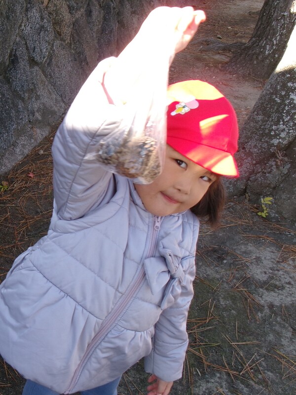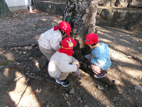| 牛久保八幡社へ出かけた ちゅうりっぷ組。 まつぼっくりを見つけて大満足w |