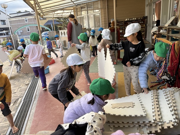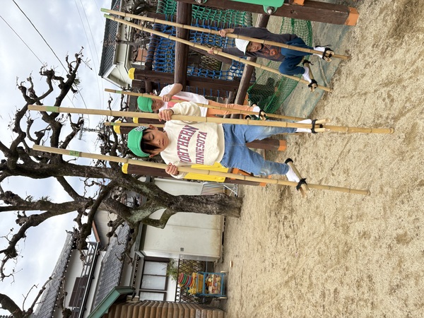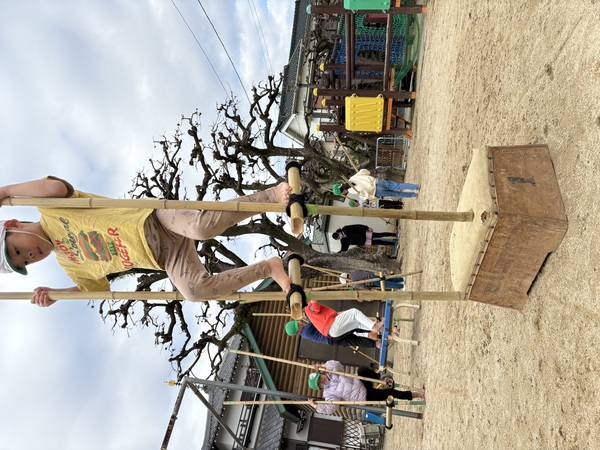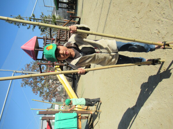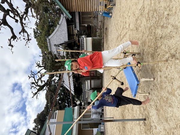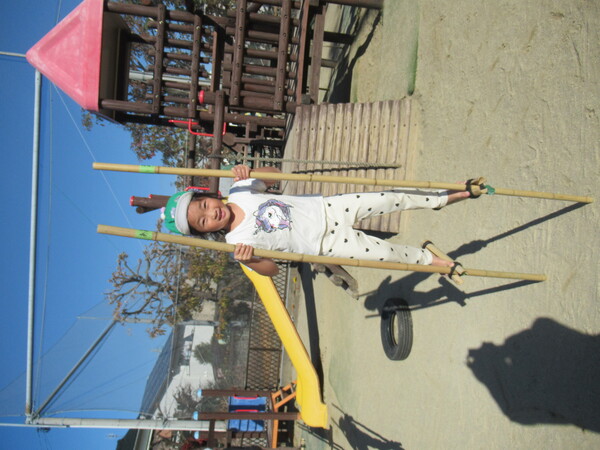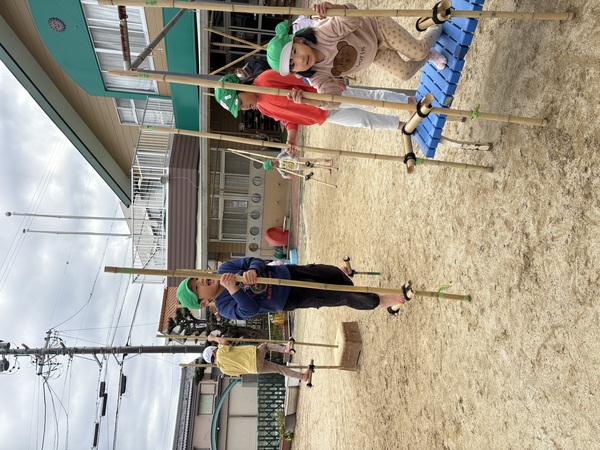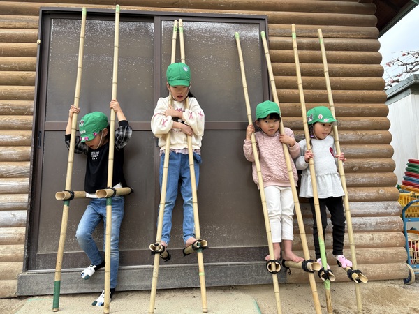 | すっかり竹馬をマスターしつつある さつき組のみんな。 あんなに最初の1歩が踏み出せなかった子たちが、園庭を余裕でかっ歩w 竹馬乗り大会が楽しみです! |