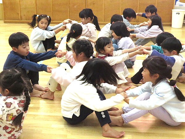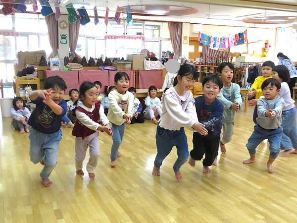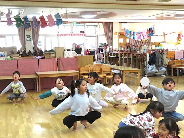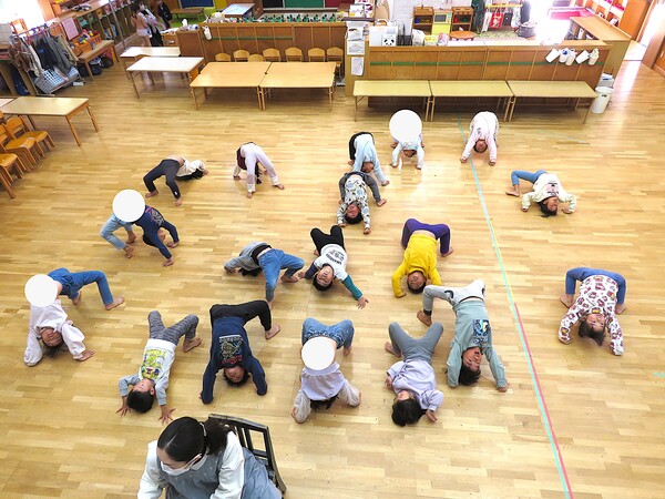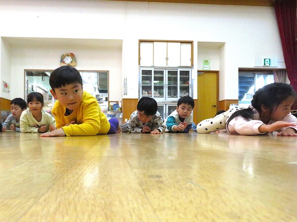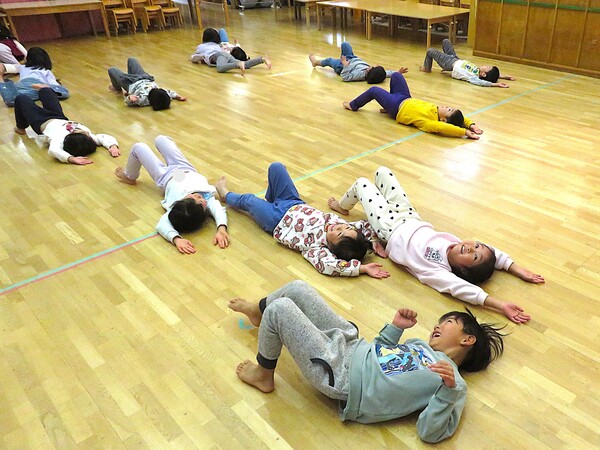 | 寒さで縮こまった体を動かそう! ホールでピアノ伴奏にあわせて、のけぞり、しゃがんで、はいずって、歩いて、走って、スキップ! |