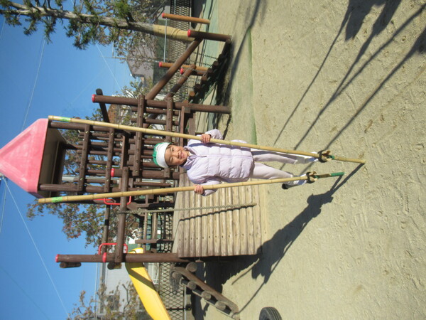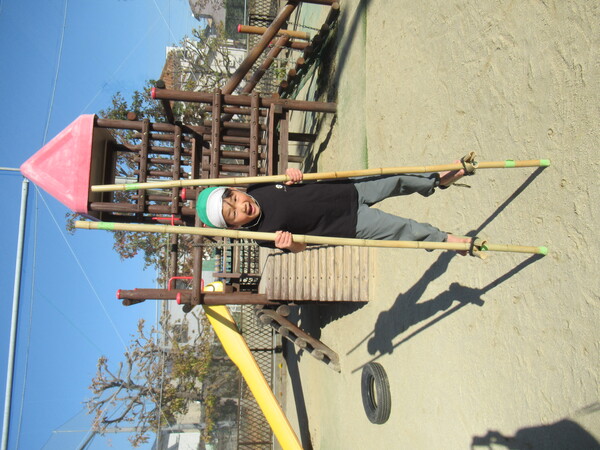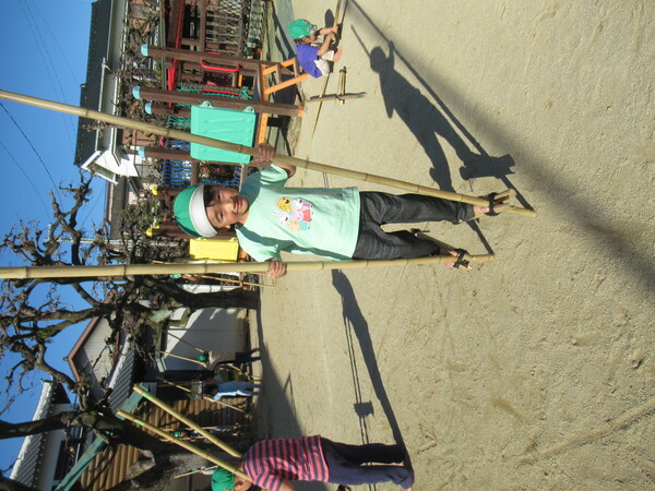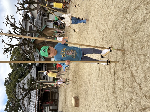 | 寒空の下、さつき組の竹馬の練習は続きます。 足場をずっと高い位置にしてひょいひょい乗りこなす強者w 必要以上の?大股でかっ歩する強者w 障害物を危なげなくクリアする強者W 片足乗りでひたすら回数をカウントするチャレンジャーまで登場! 「乗れない〜!」と、ついこのあいだまで諦めていた子も乗りこなすようになってきています。 みーんな、努力の賜物です |