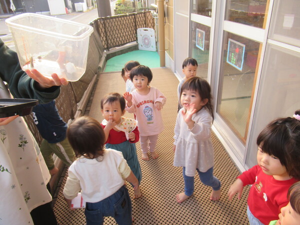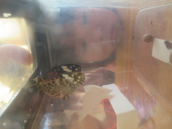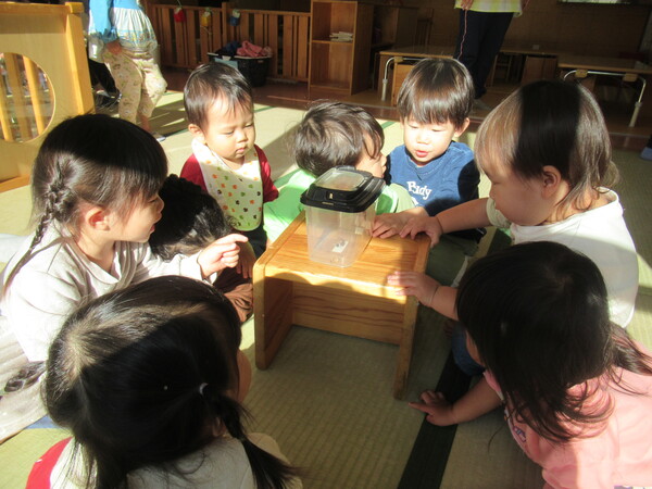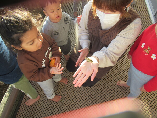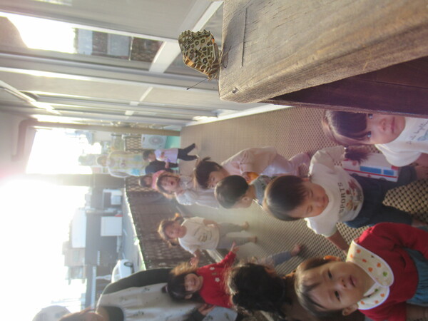 | 春から秋にかけて羽化するツマグロヒョウモン。 もも組の虫ケースの中のサナギが見事に羽化しました。 徐々に羽を広げ、立派なチョウになったところを見守った もも組のみんな。 ケースを取り囲んで、のぞき込んで、興味津々です。 しばらく一緒にお部屋で観察したあと、ベランダでリリースしました。 寒さもあったけど、それ以上に、もも組のみんなとのお別れが名残惜しかったのかな? なかなか飛んでいかない、あまえんぼちゃんのツマグロなのでしたwww |