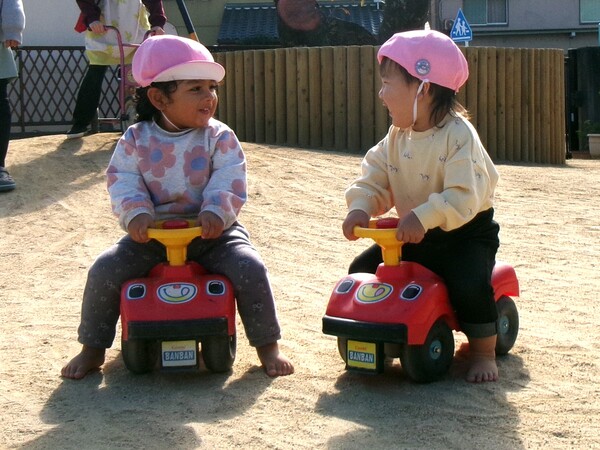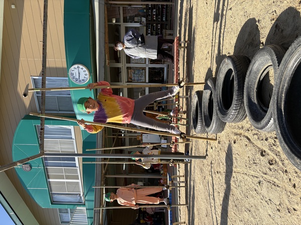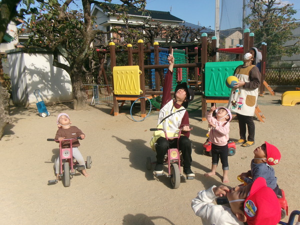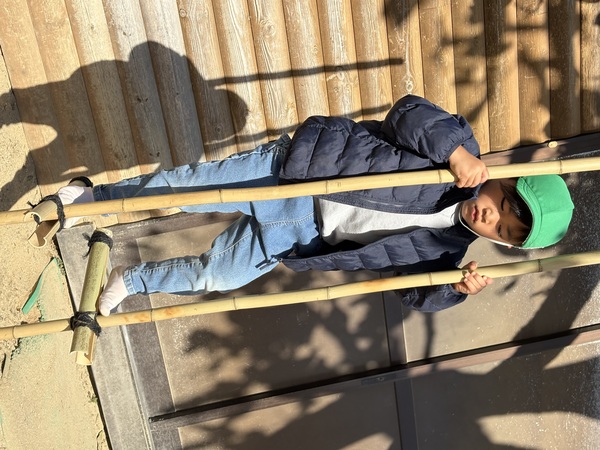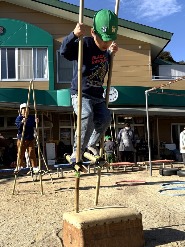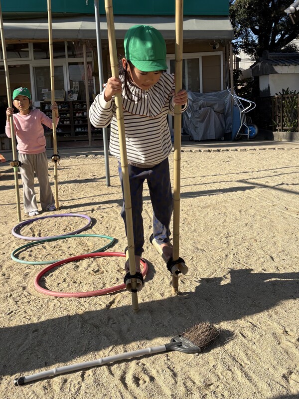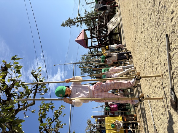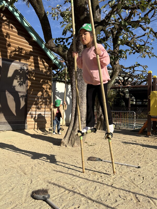 | 竹馬の乗れる子がずいぶん増えてきました。 ひとたび乗れるようになると、すぐに片足ケンケンしたり、バックで進んでみたり。 技術向上に余念がない さつき組。 障害物を乗り越えてみたり、またいでみたり、肩幅より広く足をひろげて歩行したりと、 なんともアクロバティックな乗り方に挑戦。 その向上心に感服です! |