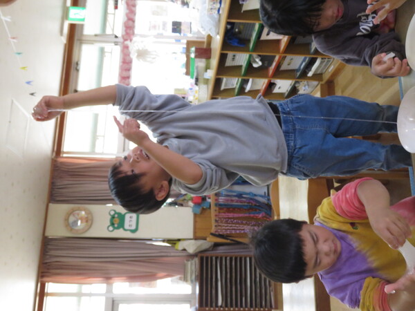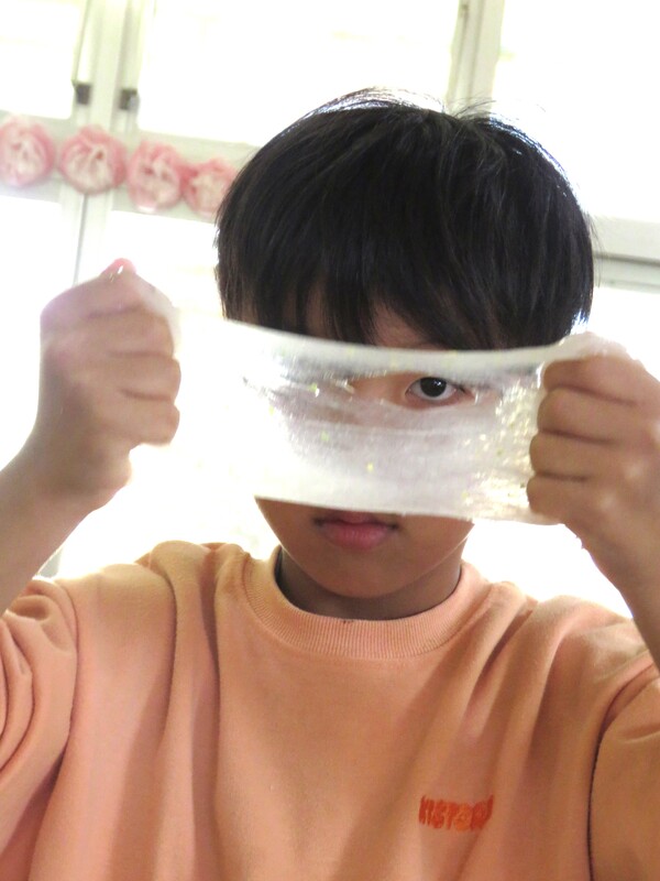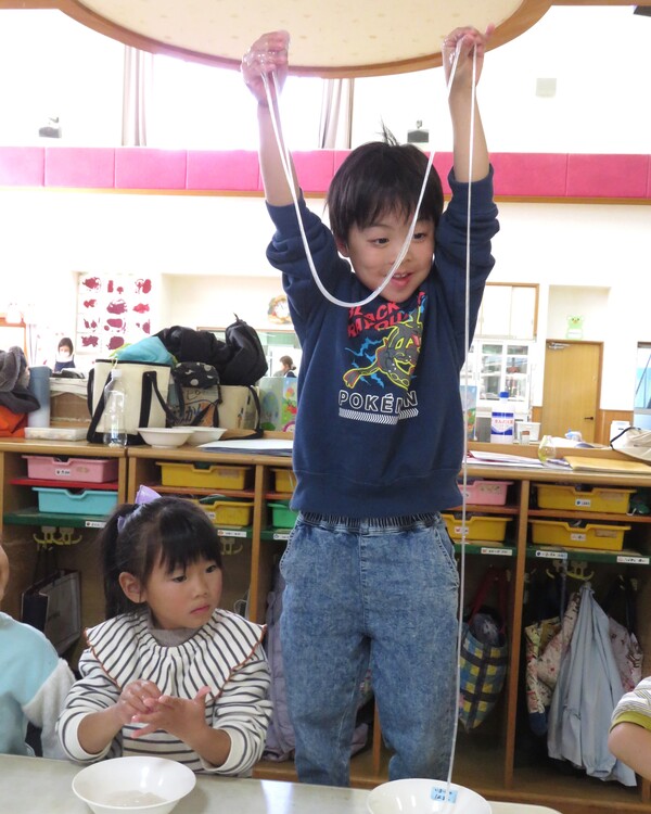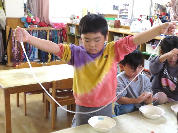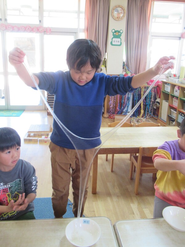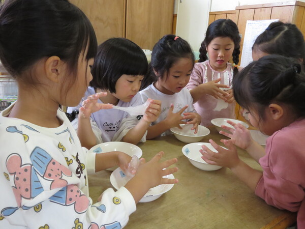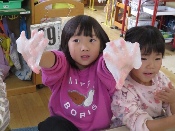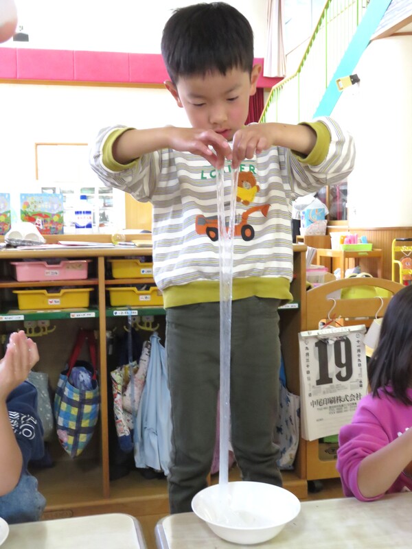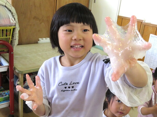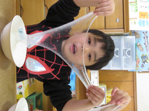 | さつき組がスライム遊びを楽しみました。 絶妙なトロトロ具合でみんな伸ばしたり、垂らしたり! あぁ!髪の毛につけないように、気をつけてねwwwww |