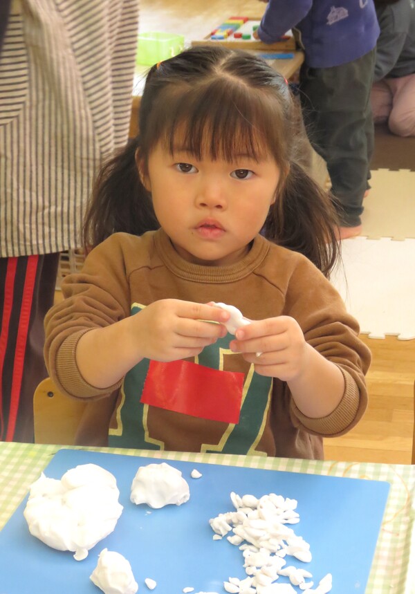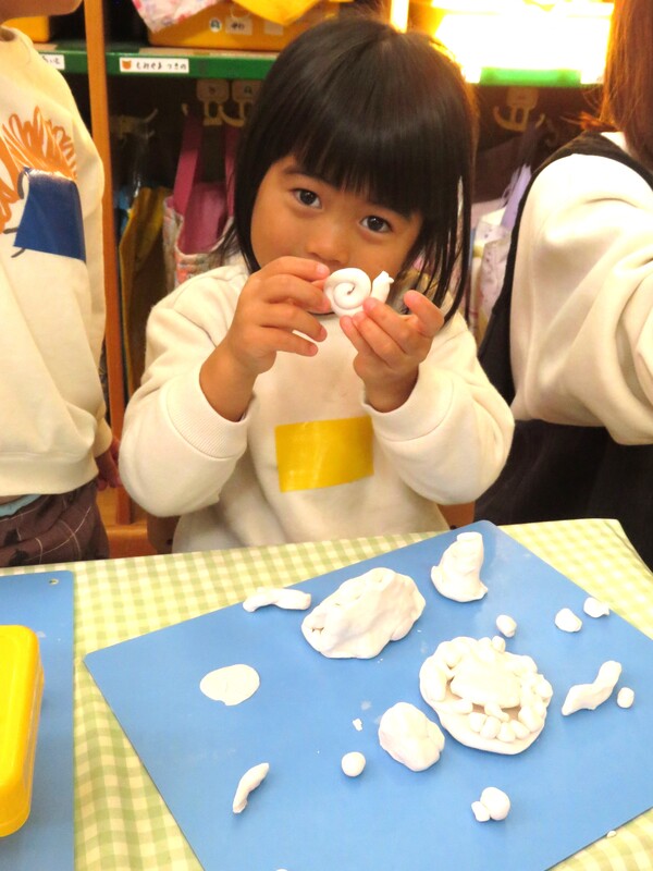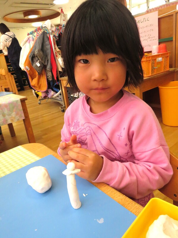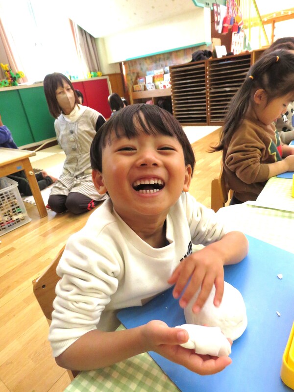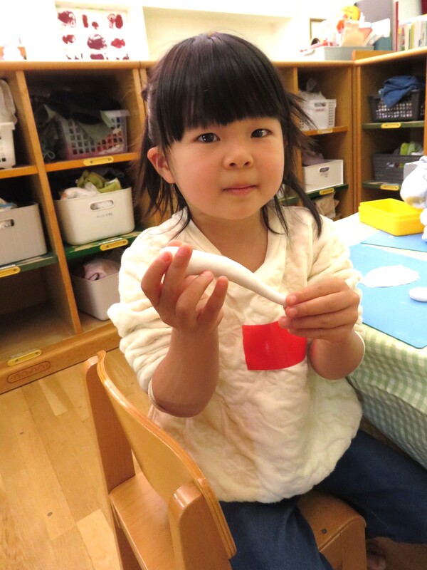 | たんぽぽ組が粘土あそび。 何作ってるの?って、きいてみたら 「鼻くそ〜!」の連続💦 いやいや、違うでしょ! 雪だるま、アイス、きこの、指輪などなど・・・ あー良かった。全員、鼻くそやウ〇チだったらどうしようかと思ったよ〜 |