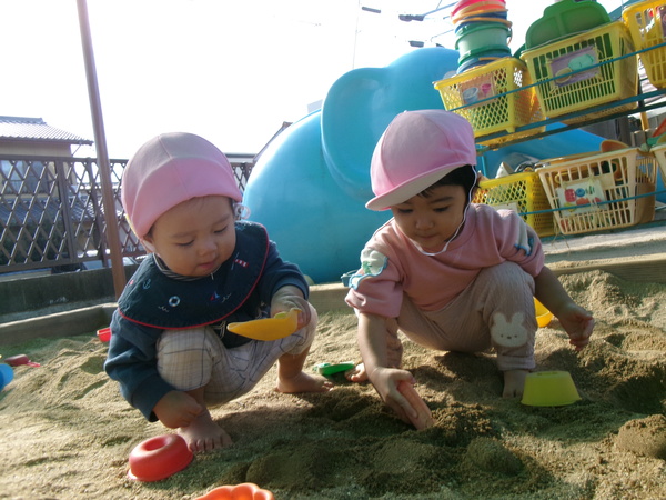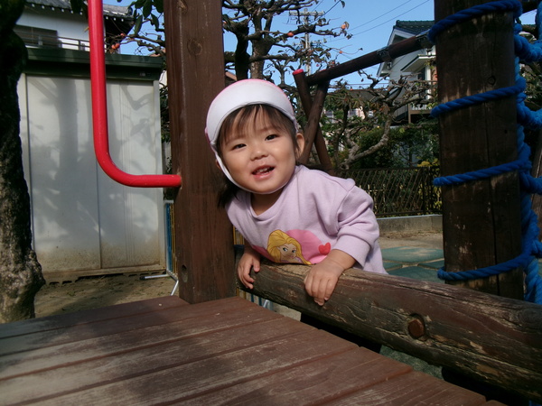 | 桜の枝がなくなって、なんだか寒々しい園庭ですが、 ひんやり秋の日には、日差しがとどいて明るい感じ。 赤&桃色の帽子が元気に遊びまわりますw |