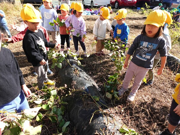 | 光輝菜園のサツマイモ畑には青々としたサツマイモの葉が。 みんなで植えた苗がこんなにも立派に、立派過ぎに、育ちました。 いざ、さつき&ふじのみんなで、いもほりに出陣だぁ! ツルをはぎ取り、マルチシートをひっぺがし、掘って掘って掘りまくり! 虫は出てくる、足も手も土まみれ、しりもち、鼻水?大騒ぎ! わいわい、ぎゃーぎゃーと、どでかいサツマイモを掘り出しました。 掘ったサツマイモからお好きなの選んでお持ち帰り。 お家で美味しく食べてね、どでかイモwww |