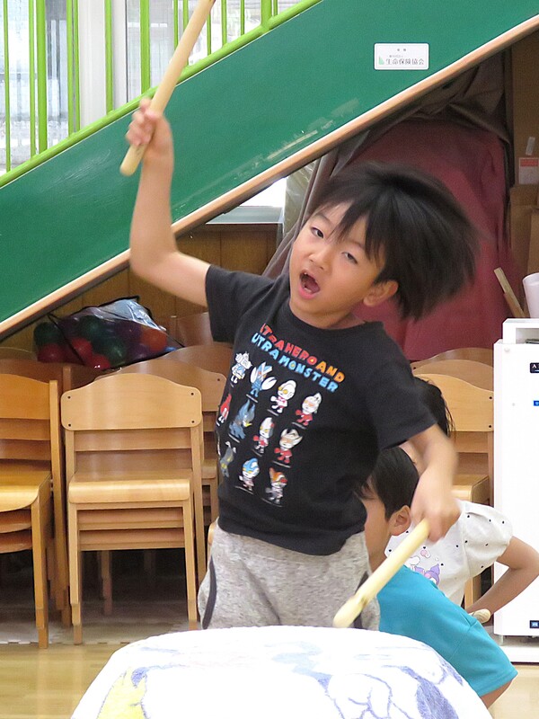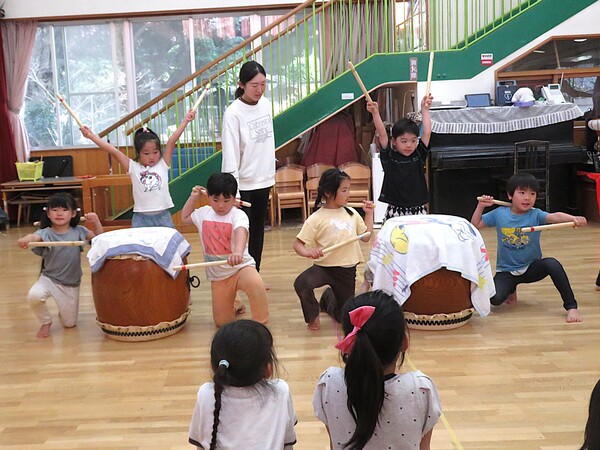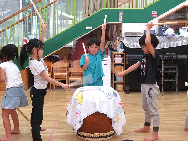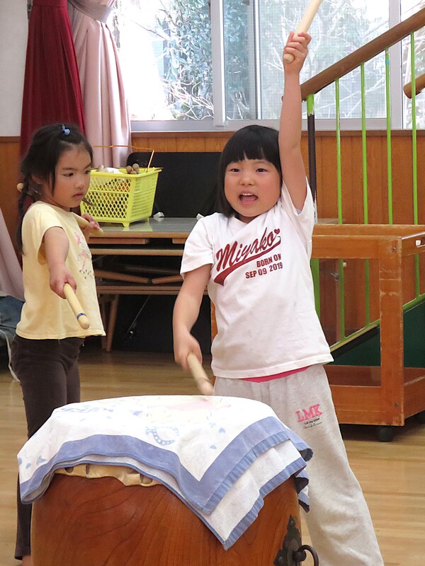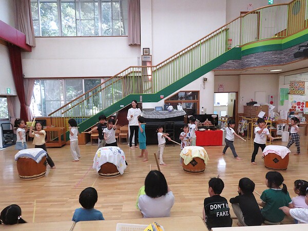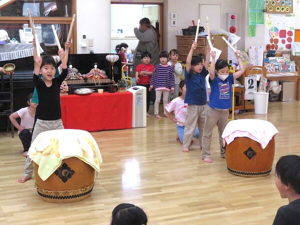 | 3月に入りました。卒園をひかえ、さつき組がホールに4台の太鼓を並べて演奏の練習です。 ゆみちゃん、たけちゃんとともに、いい音を響かせます! |