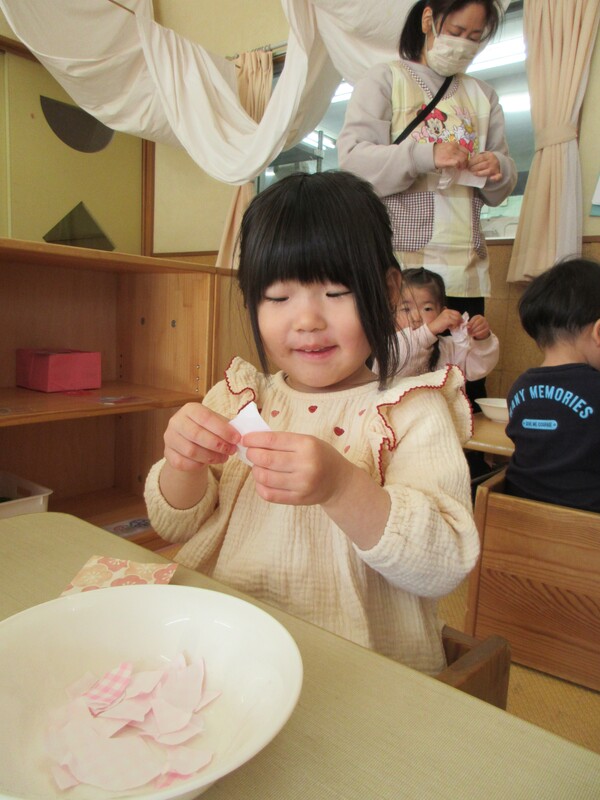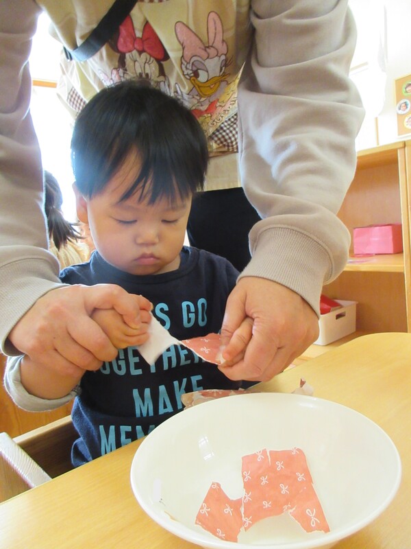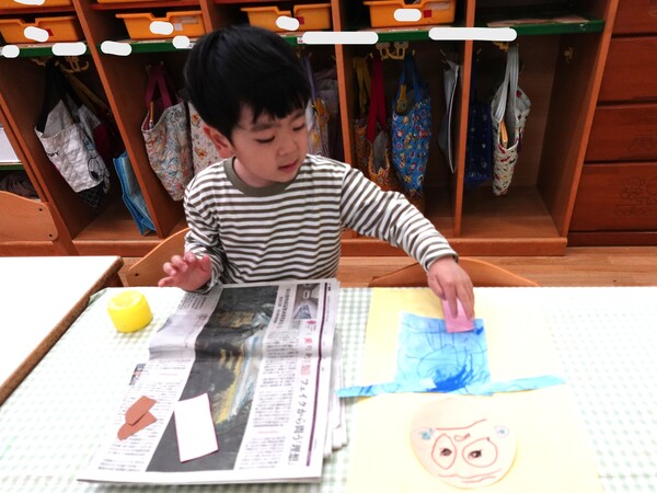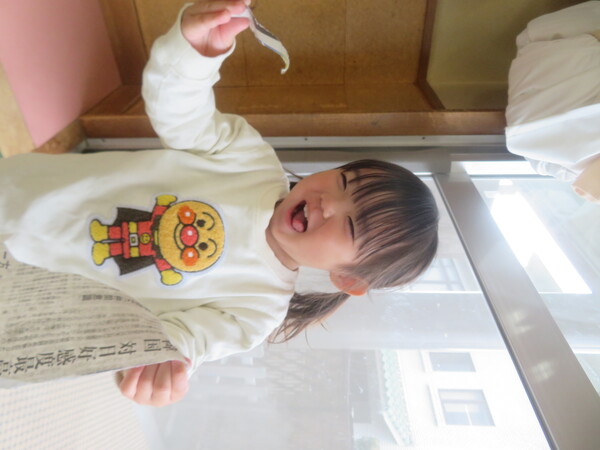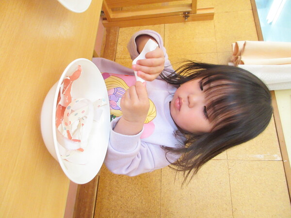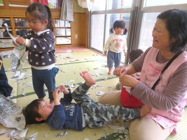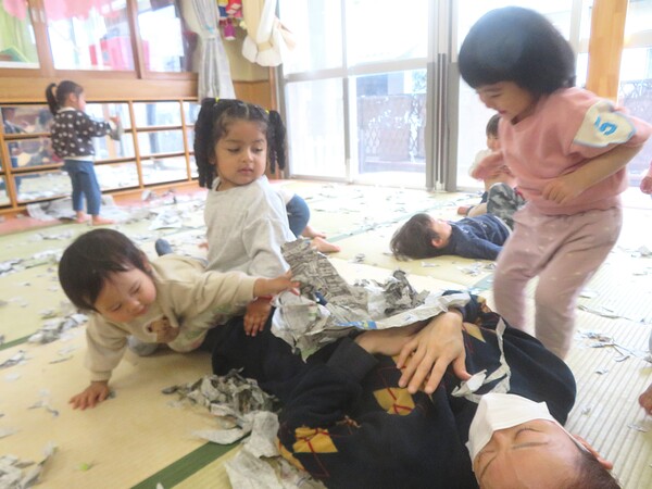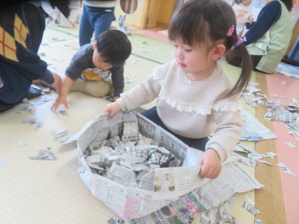 | もも組、新聞紙をちぎって、なげて、戯れてwww | ||