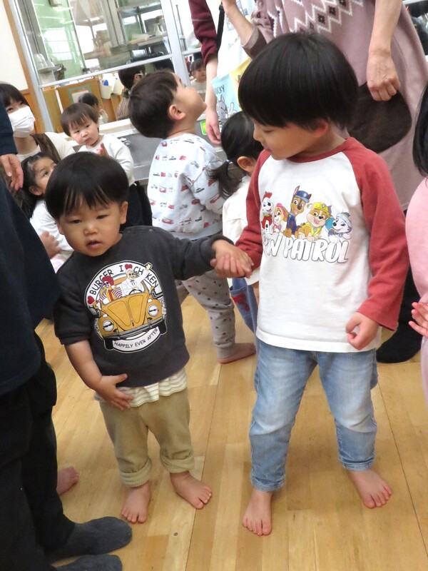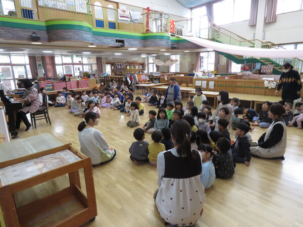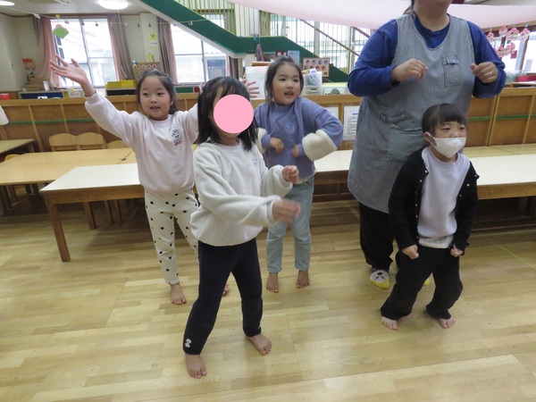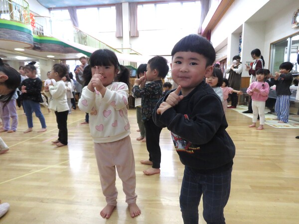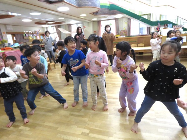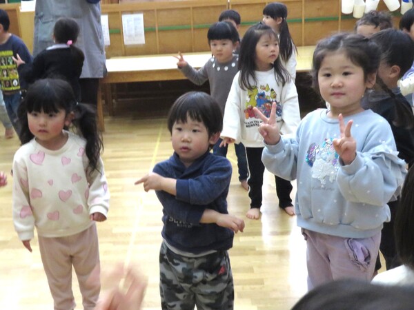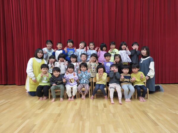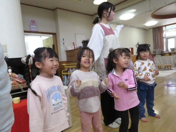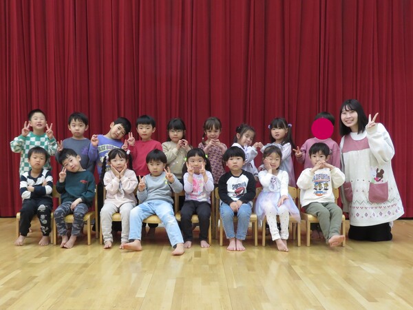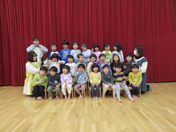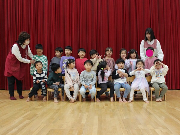 | 2月生まれのおともだちのお誕生会。 ほのかちゃんとゆめなちゃんからのお楽しみ出し物でお祝いです! みんな、お誕生日おめでとうございます! |