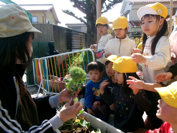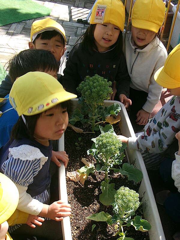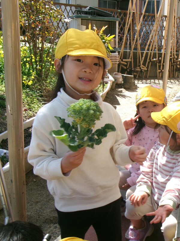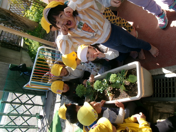 | プランターで育てていたブロッコリー。 採り頃、食べ頃。 みんなで収穫です。 |
