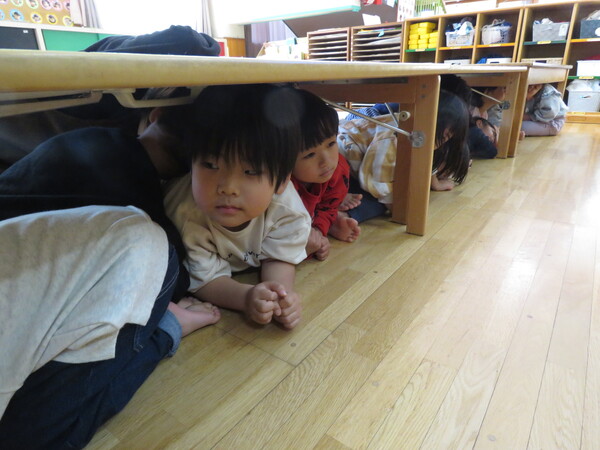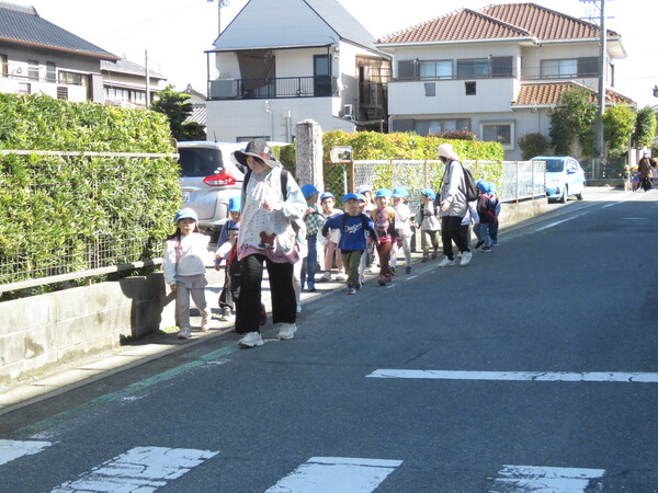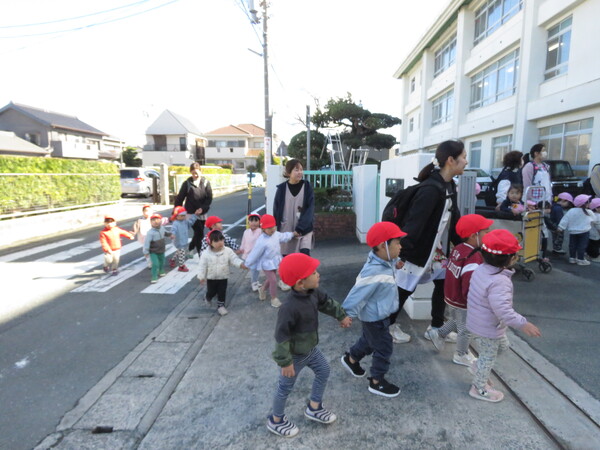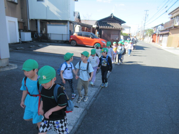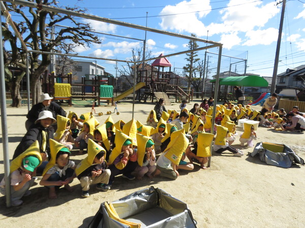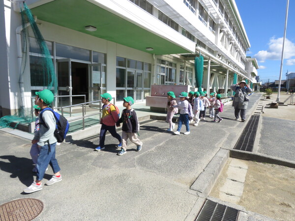 | 年度末の締めくくりの総合避難訓練。 大災害発生を想定して、牛久保小学校まで全クラス、歩いて避難の練習です。 さつき組は、訓練に合わせて牛久保小学校敷地内を見学させていただきました。 |
