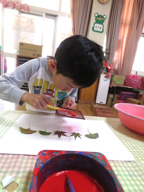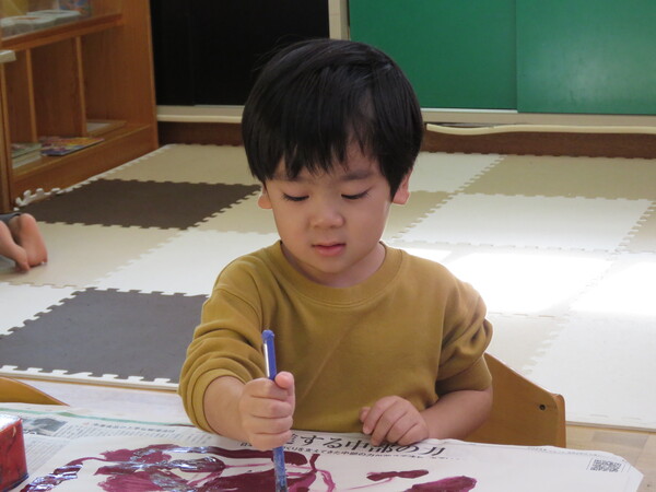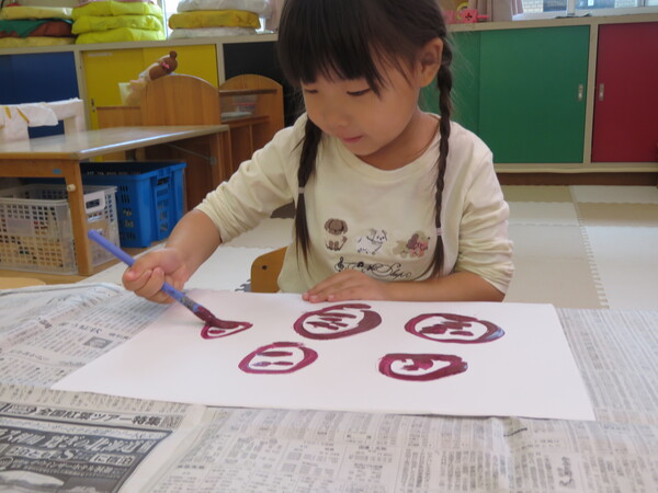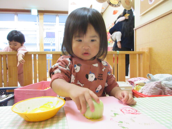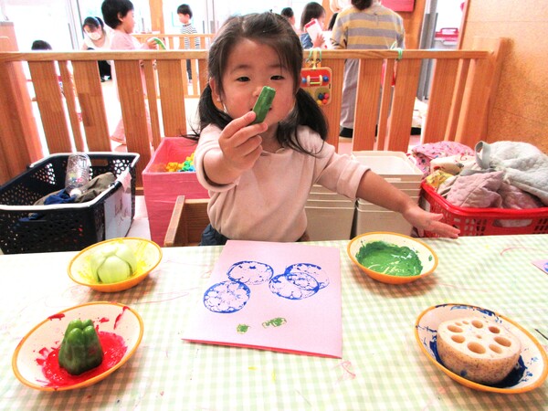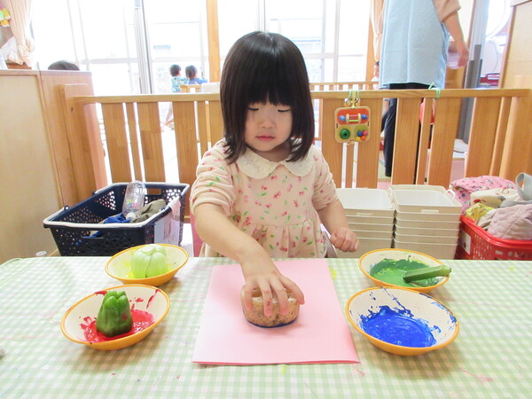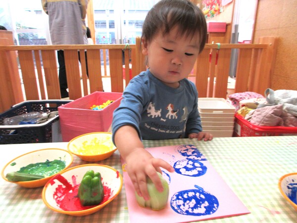 | いろんな野菜をカットして、ペタン!ペタン! 切り口の模様がおもしろくて、不思議で、ペタン!ペタン! 夢中でスタンプ、もも組さん! |