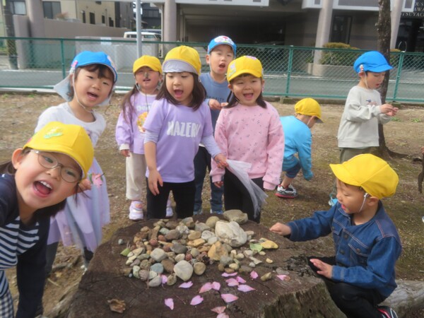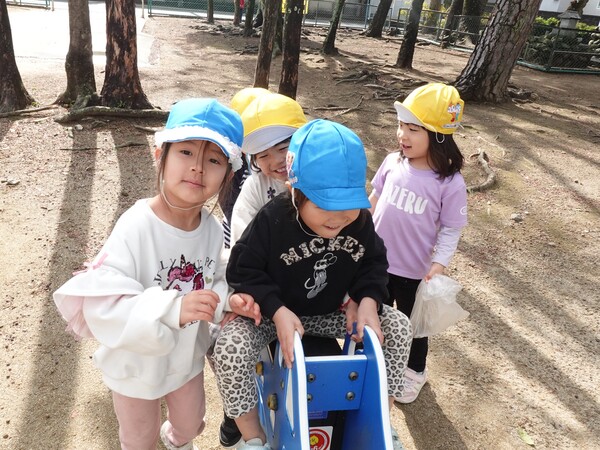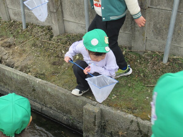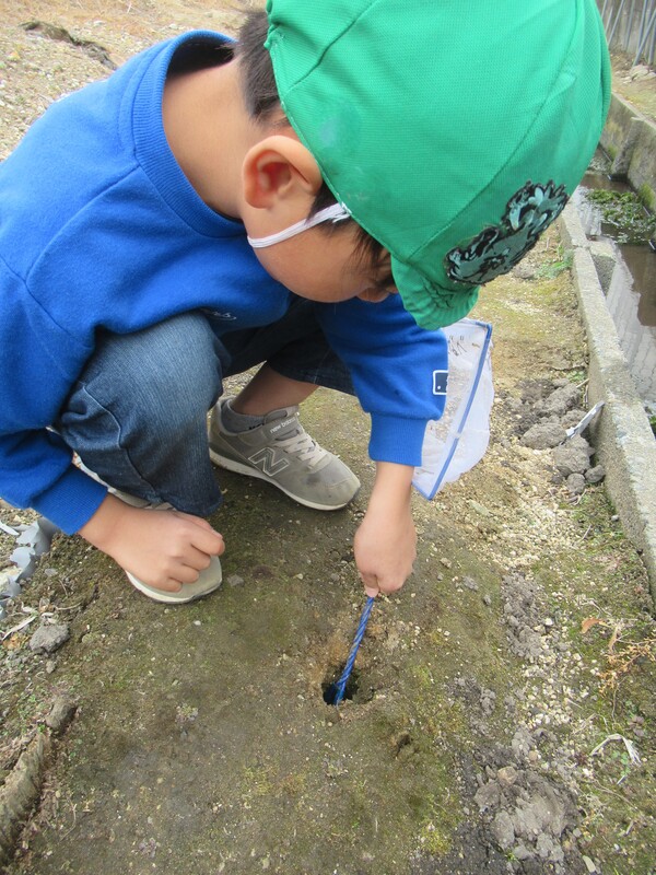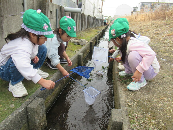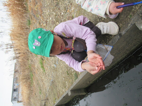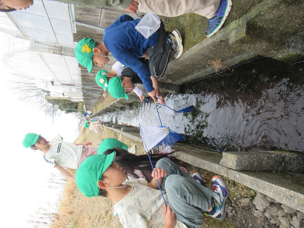 | お散歩大好き、光輝保育園のみんなですが、過去、この寒い時期に「ましみずの里」に行ったことがあったかしら? でも、もうぽかぽかの春の陽気。さつき組もゆみちゃんも我慢できず、アミを片手に ましみずの里へ生き物探しに でかけちゃいました! |