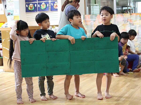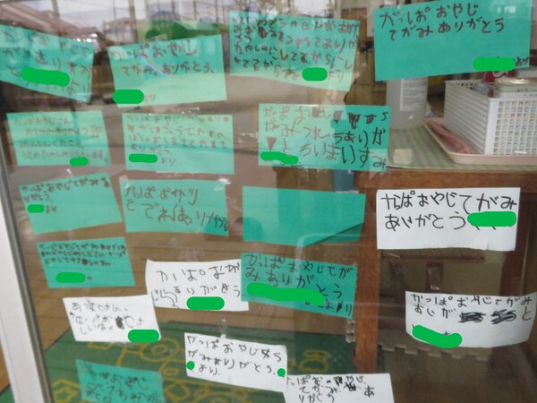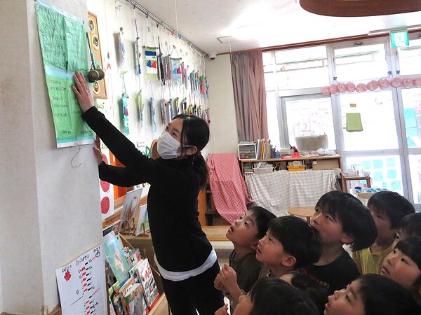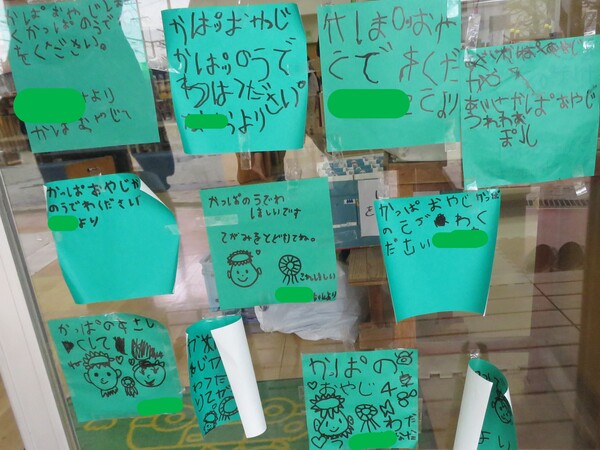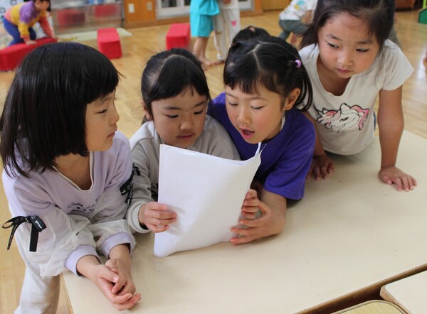 | 水不足が心配されるほど雨の無い日が続きました。 さつき組のみんなは、深刻な水不足と同じくらい心配なことが・・・。 そう、お別れ遠足が近づいてきているのに、お手紙書いて出入口に貼っておいたのに、 かっぱおやじから何の音沙汰もないのでした! でも、昨夜から雨が降り始め、空気がしっとりした今日、なんと、ふたたびかっぱおやじ からの手紙が届いていました!おっかなびっくり、お手紙に目を通すと、赤塚山まで かっぱのうでわをとりに来るがいい、とのお誘いです。 これはもう、お別れ遠足でギョギョランドまで歩いて行くしかないでしょ!💦 |