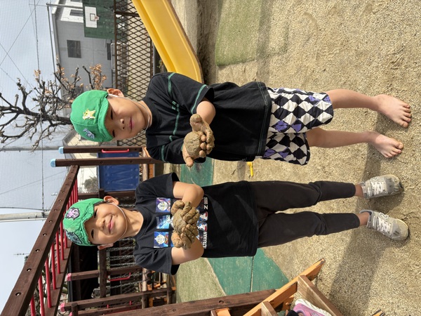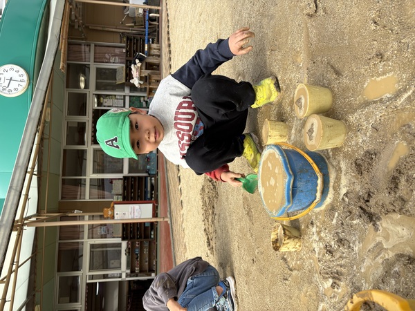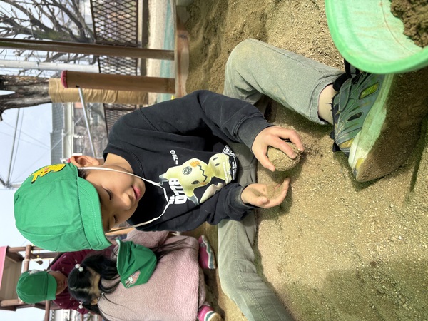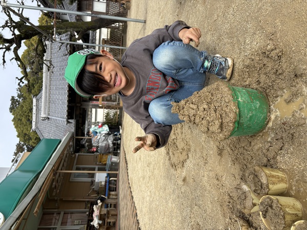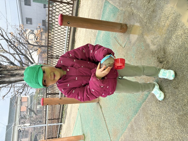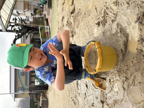 | しっかり雨が降り、園庭に水たまり、そして、天然の「どろんこ」がたっぷりと♡ さっそく、かきあつめて こねくりまわして、お好みの食べ物に!? |