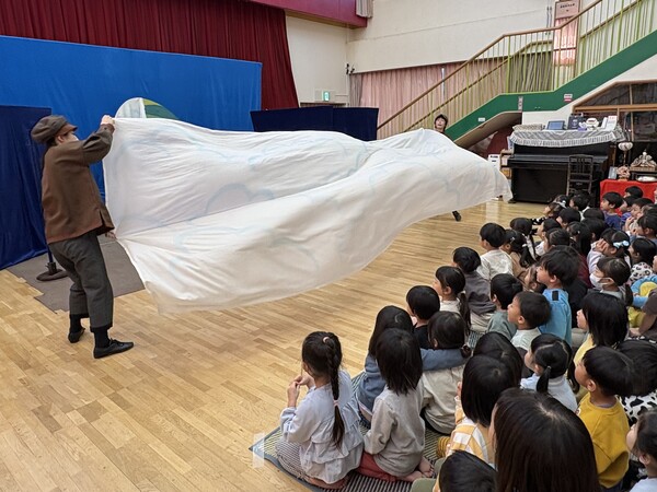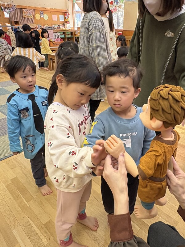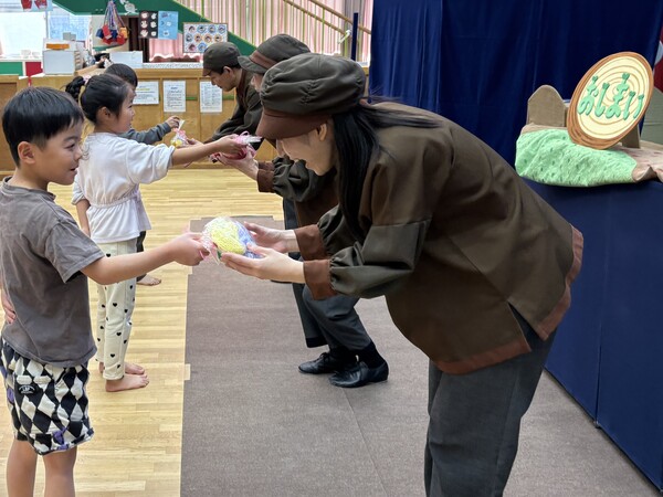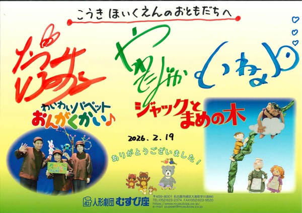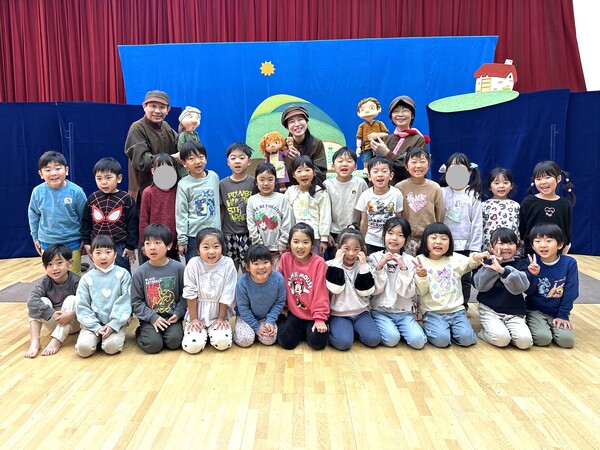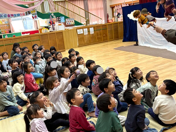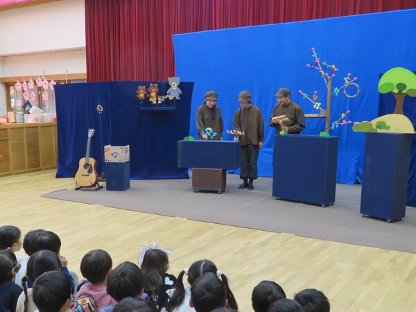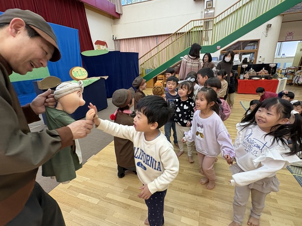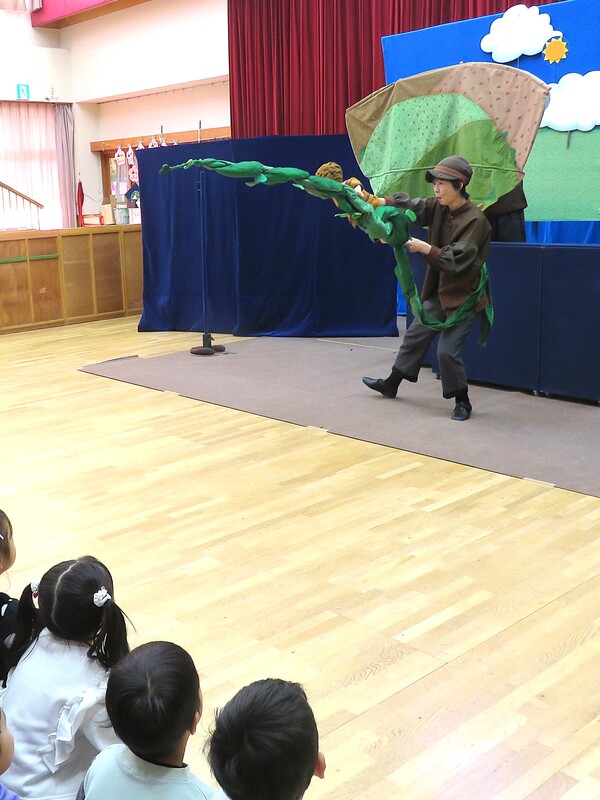 | 今日は、ひまわり会主催の人形劇鑑賞会(たんぽぽ・ふじ・さつき組)。 今年度2回目の「むすび座」さんの公演です。 「わいわいパペットおんがくかい♪」と「ジャックと豆の木」の2本立て。 楽しい歌や演奏、お芝居、そして、子ども達の想像をかきたてる演出に、みんな大喜び。 むすび座のみなさん、すてきな人形劇をありがとうございました! |