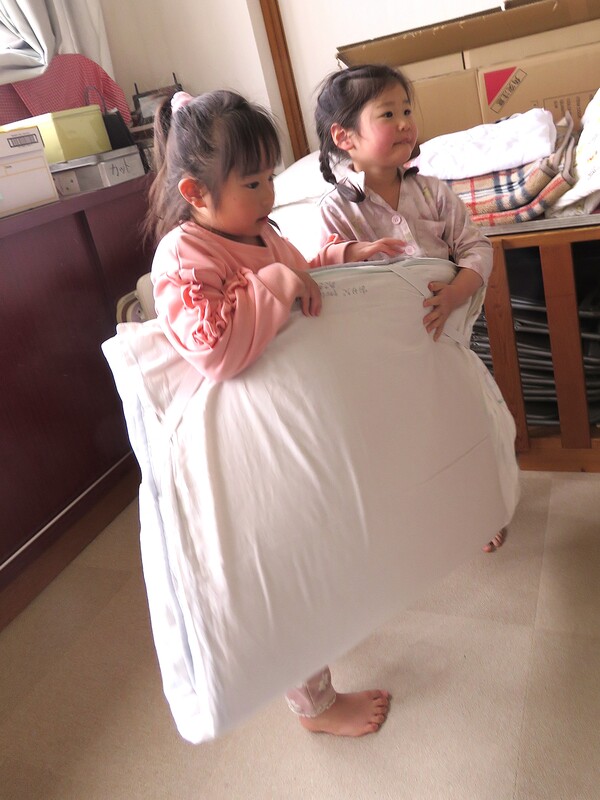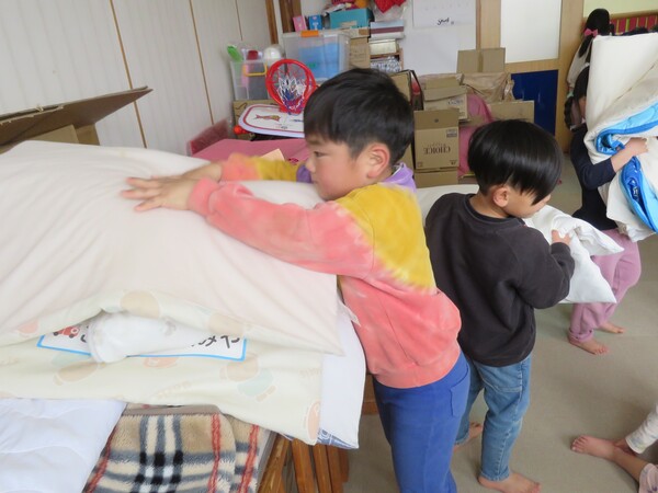| 節分のとき、鬼退治用に作った大きな「新聞豆」。 雪にみたてて、ホールで雪遊びごっこに興じる さつき組。 ソーランと太鼓の練習前の準備運動がてら、遊んで体を動かそう! |