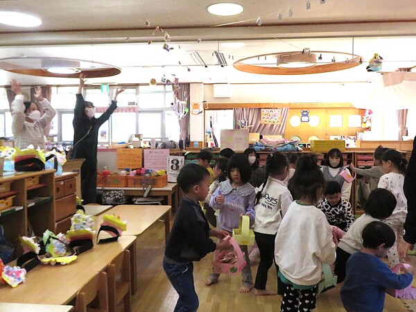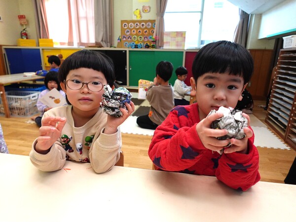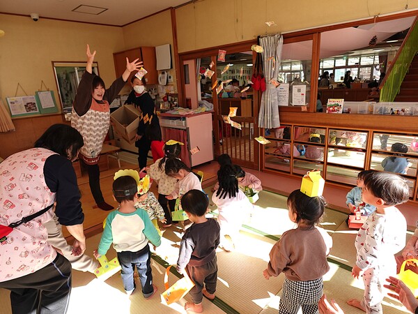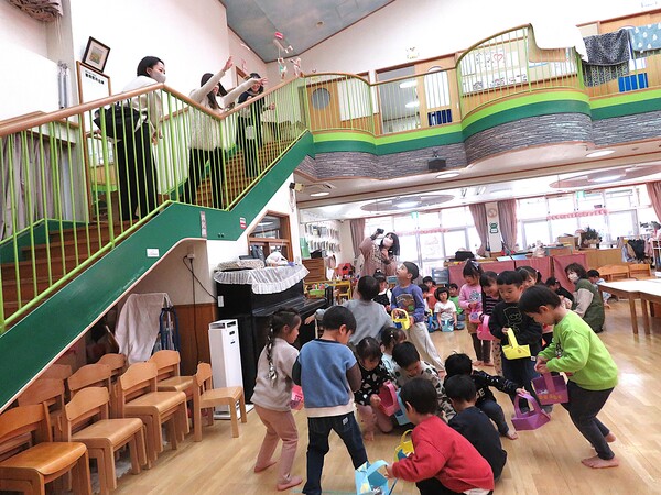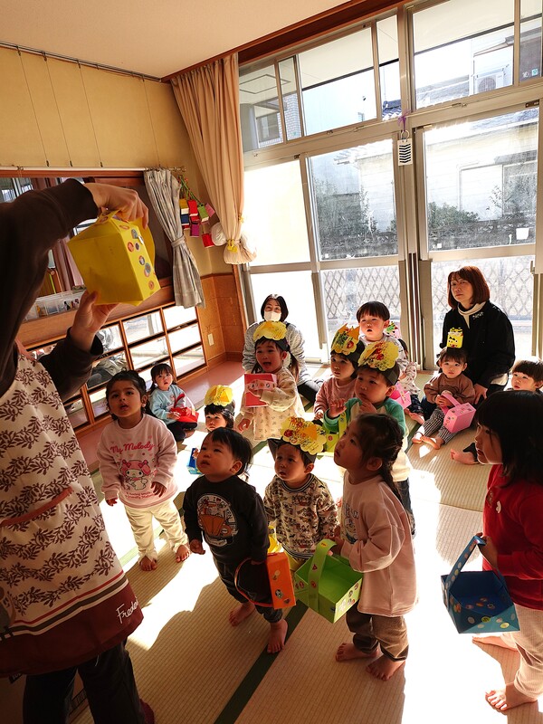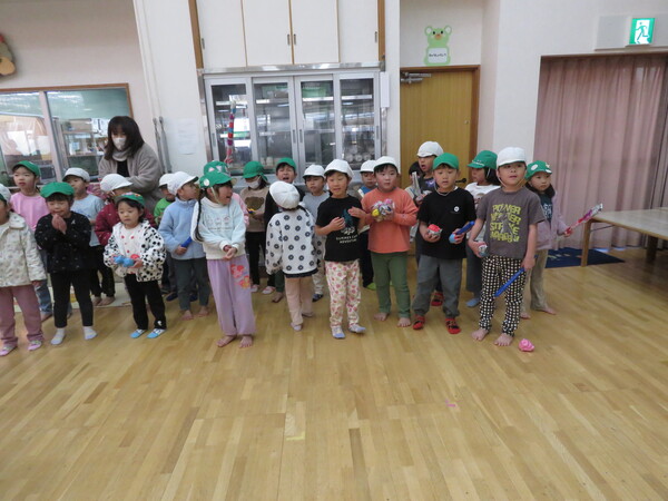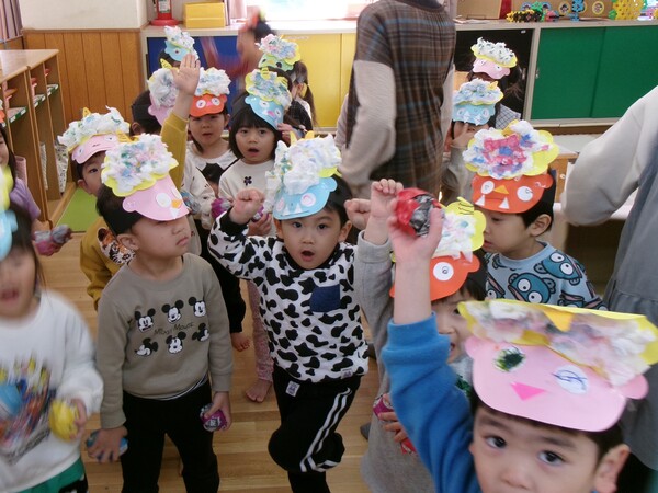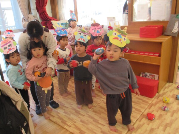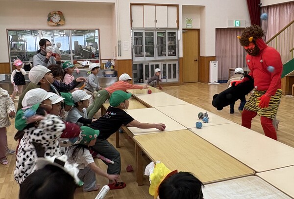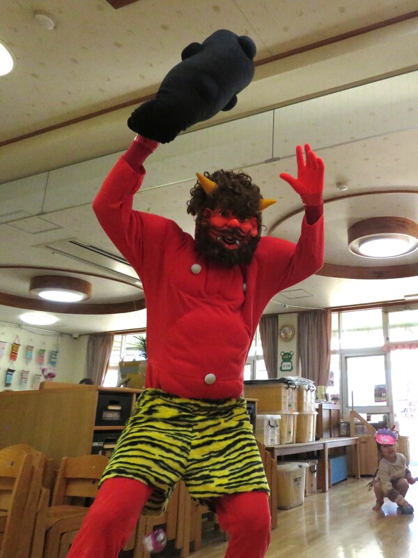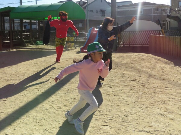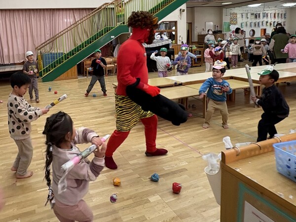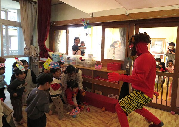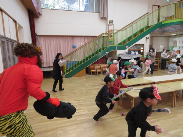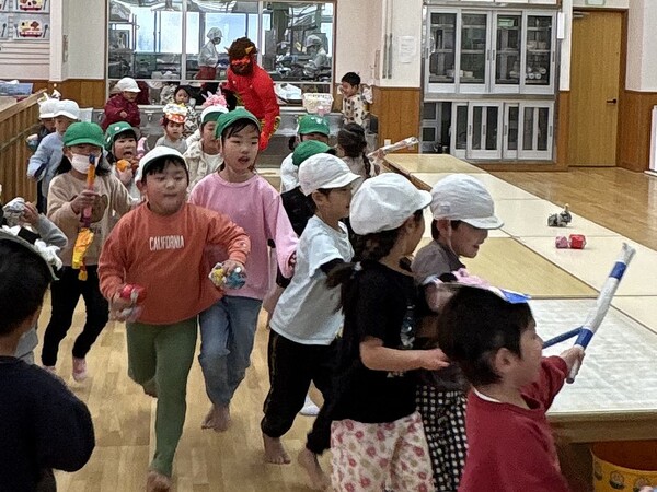 | いよいよ節分。 嫌な予感は的中し、いよいよ赤鬼が大きなこん棒を手にやってきましたぁ! さつき組!年長児として、みんなを守って!・・・って、逃げ足早っ! えええええーー!もも・ちゅうりっぷ組のところまで鬼の侵入をゆるしてしまったぞ! って、それでも逃げ上手のさつき組w おいおい!後輩を守っておくれよぉぉぉぉ と、ふじ&たんぽぽ組から果敢にも赤鬼に挑む剣士あり! 行け!即席「鬼〇隊」たち!なんちゃらの呼吸でナントカントカの技を繰り出すのだぁ! かくして、2度の来訪を退け、平和を取り戻した光輝保育園なのでした・・・ (赤鬼さん、本当にありがとうございました!) |