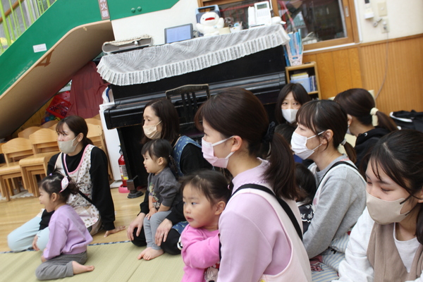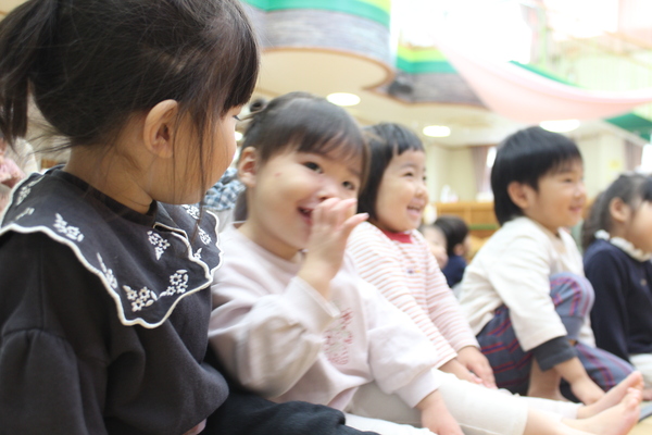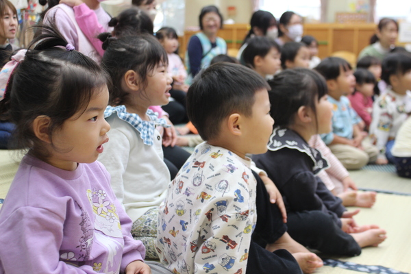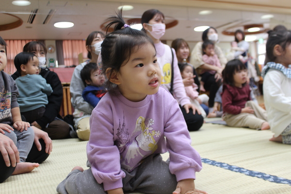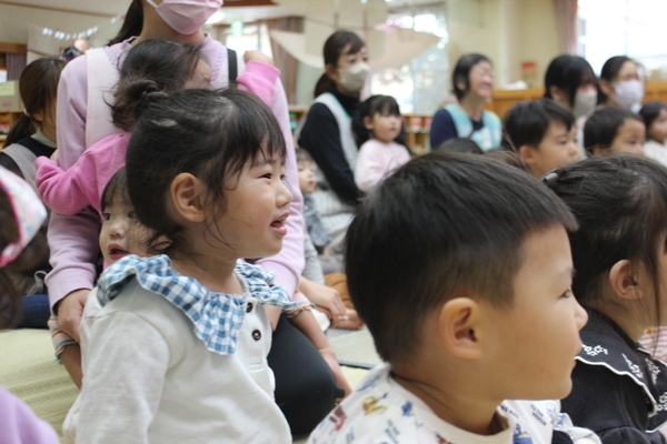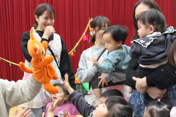 | 11月27日乳児さん向けの人形劇鑑賞会がありました。名古屋の人形劇団「むすび座」さんの人形劇です。キラリの子どもたちも光輝保育園に見に行ってきました。さっすが、プロの人形劇、子どもたちをぐっと引き付け、みんな夢中になって見入っていました。ただ、小さな子は見慣れない不安感や、怖さで泣けてしまった子もいましたが、優しい人形とお話にみんな癒されたようです。 | ||