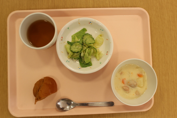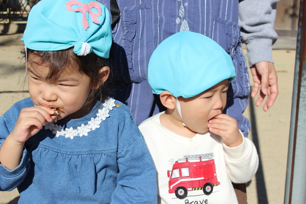 | 12月に入り、寒さが日増しに強くなっていますね。そんな冬メニューがたくさん出てきました。クリームシチューに味噌おでん。温かい汁物も嬉しいですね。手作りおやつのコーンとウインナーの蒸しパンは子どもたちにの人気です。そうそう、初めてのメニューも出てきました。さかなのかりんと揚げです。白身さかなを素揚げして、白ごまと黒ゴマの入った、甘辛のたれが絡ませてあります。おいしく頂きました。 | ||