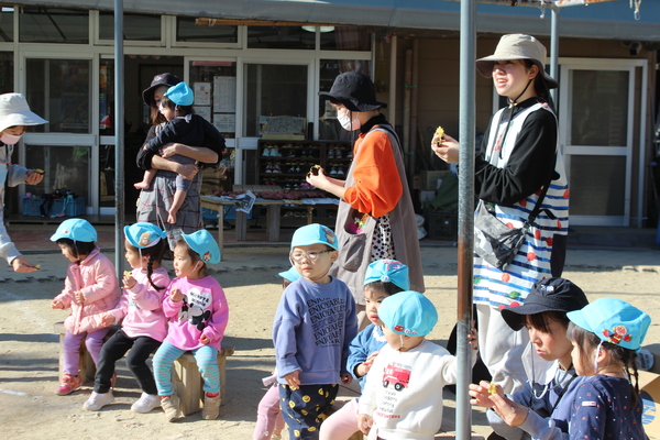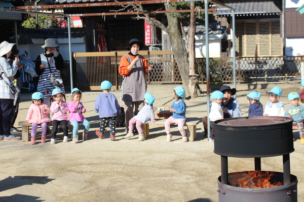 | 今日は光輝保育園のやきいも会でした。光輝保育園の園長先生のお手伝いで、キラリの前園長、「じいじ」がお手伝いに来てくれました。ドラム缶の石焼きいもです。いいにおいがしてきましたよ。キラリの子どもたちも焼き立てを味見させてもらいます。あまーく、やわらかくなったおいもは最高です。 | ||