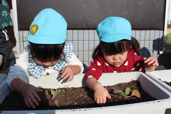 | キラリ出身で現在、光輝保育園にお子さんが登園している保護者の方から、キャベツの苗を頂きました。以前にもブロッコリーの苗を頂き、子どもたちとプランターに植えたのですが、沢山頂いたので、芋ほりをした後のキラリの小さな畑と余った分は プランターに植えました。大きくなるのが楽しみです。 |