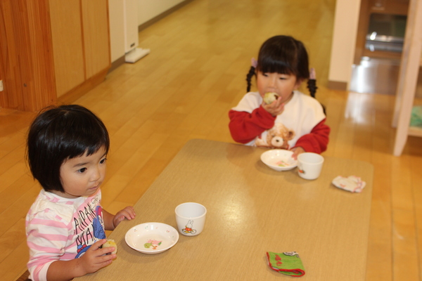 | 今日のおやつはいもご飯のおにぎりです。0歳児のボクはお粥にしてもらいましたが、おかわりが欲しくて、おかわりはみんなと一緒のご飯をつぶしながら食べました。みんなでおいしく頂きました。「ごちそうさまでした」 | ||