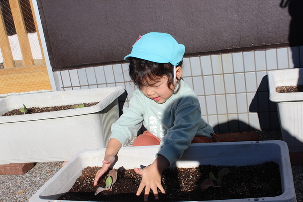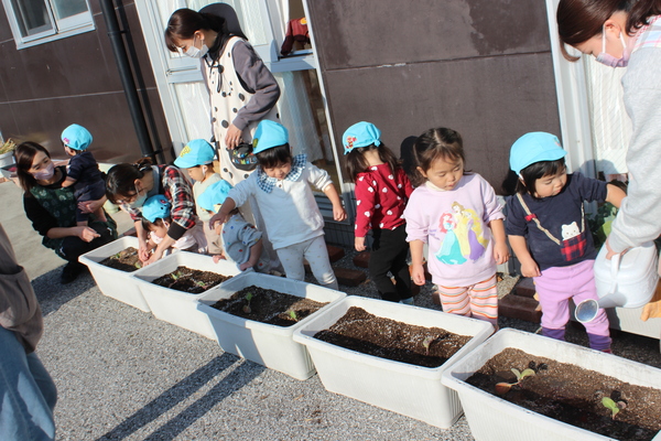| みんなでキャベツの苗を植えた後は、肥料とお水を上げました。子どもたちにも水やりのお手伝いをしてもらいましたよ。 おおきくなーれ!!成長が楽しみね。🌱 |