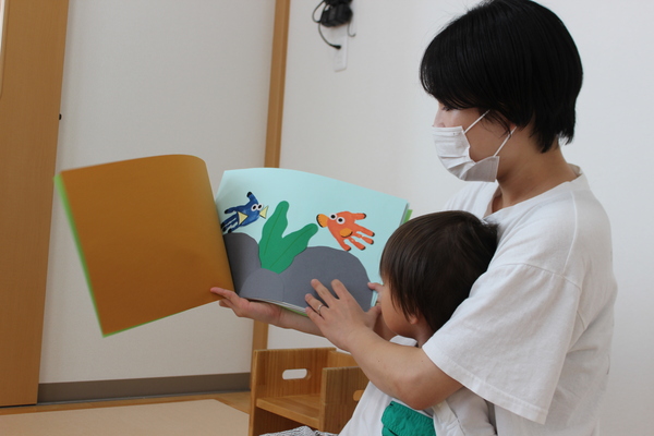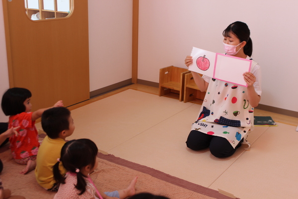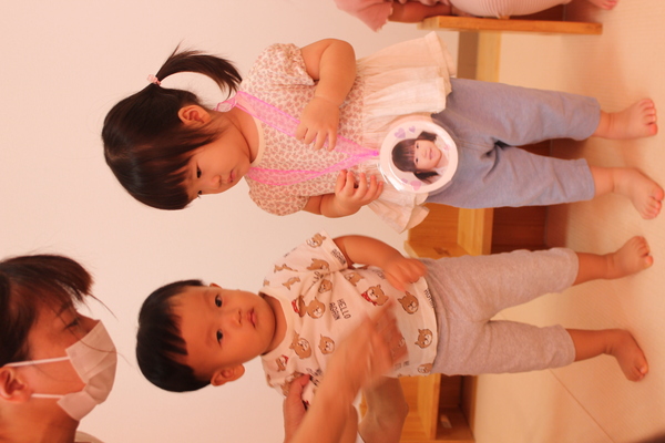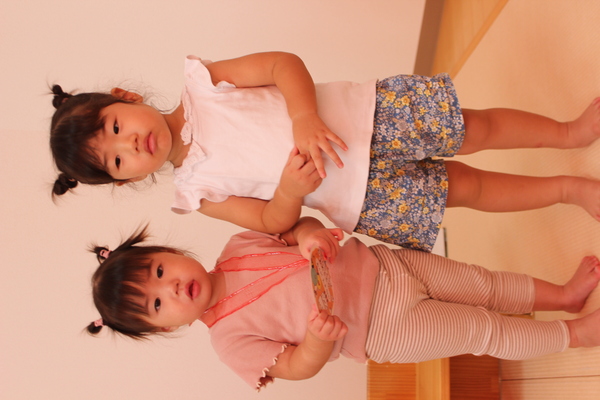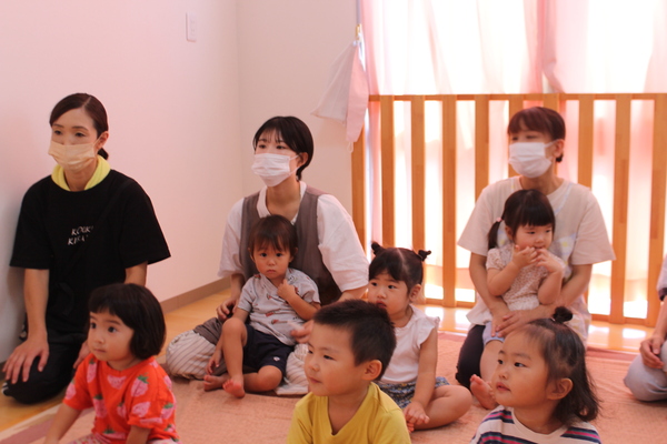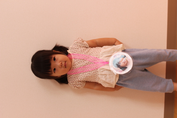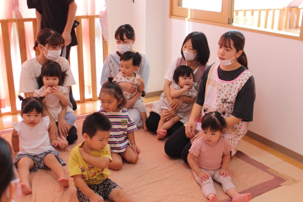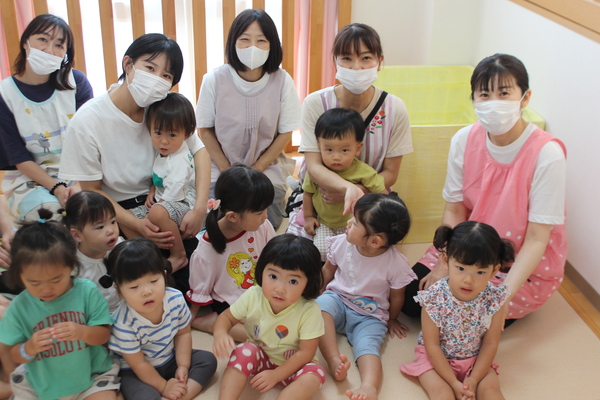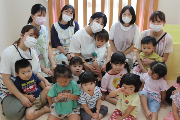 | 3時のおやつを食べた後、8月いっぱいで退所するお友達のお別れ会をしました。昨年の4月に入所し、1年と5か月間一緒に生活し、遊んできたお友達です。みんな集合すると記念の作品集と、写真プレートを同じ1歳児のお友達からプレゼントしてもらいました。寂しくなるけど、また会える時まで元気でね。 | ||