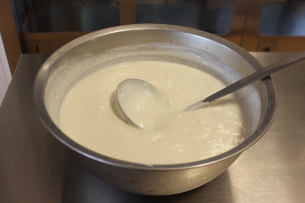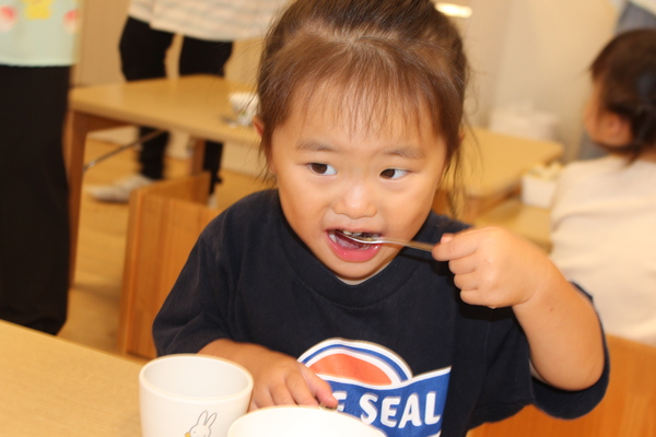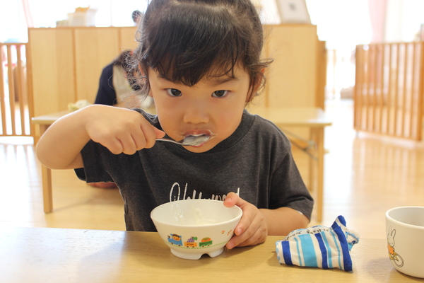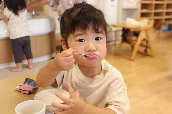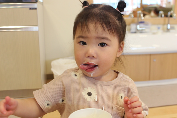 | ボールにたっぷりのプレーンヨーグルト。お砂糖を少々加えて、よーくまぜまぜ。優しい甘みとさっぱりした酸味が丁度いい味わいになっています。甘すぎず、すっぱすぎず、丁度いい塩梅です。「おかわりー」の声があちこちで聞かれます。 あらあら、お口の周りが白いおひげさん。かわいいわね💗 |