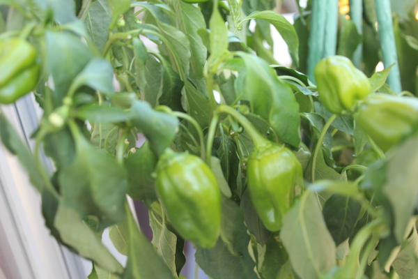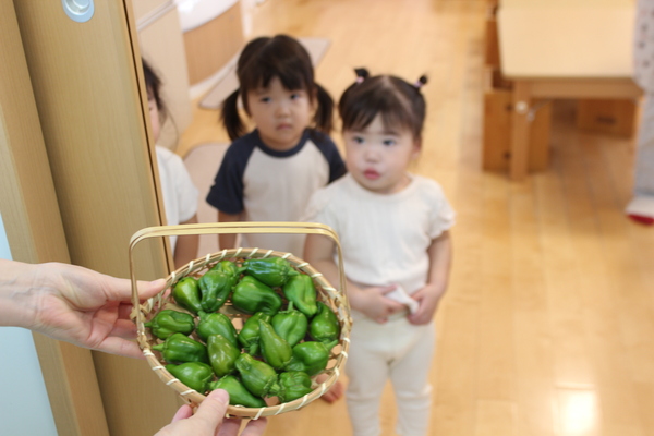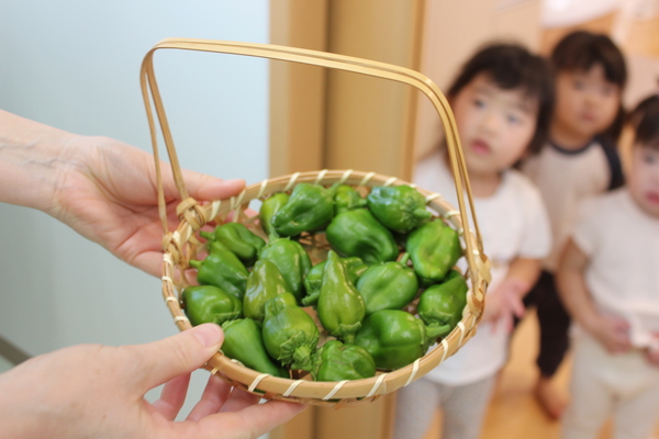 | 毎日暑い日が続いていますね。38度、39度、40度、温度計を見るのが怖くなります。そんな暑さの中、プランターの野菜たちも悲鳴をあげています。普段なら、実がもう少し大きくなるはずのピーマンが大きくなれず、数だけは沢山実のる状態で、このままだと大きくなれず、茶色に変色してしまうので、今日は子どもたちと収穫することにしました。そして、厨房へお届けです。今日はカレーライスだったので、ピーマンたっぷりのカレーになりました。オクラはまだこれから実がつきそうです。期待しましょう。 | ||