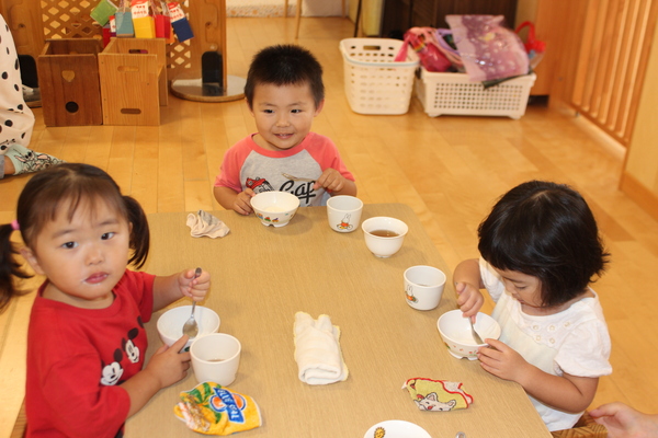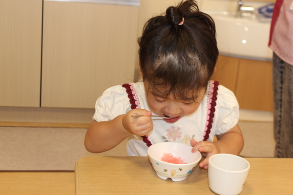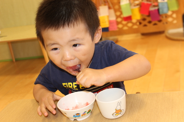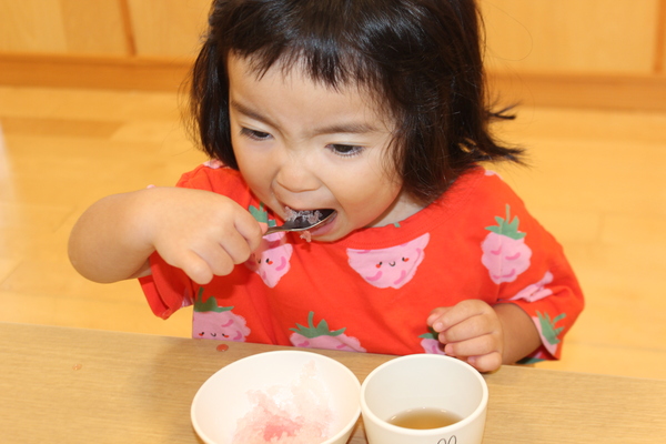 | かんかんと照り付ける太陽。あまりにも暑いので、3時のおやつはお菓子でしたが、冷たいかき氷に変更です。昨日から、調理の担当さんが冷凍庫で氷を作って用意してくれていました。そして今日のかき氷はイチゴ味です。かき氷機で氷を作り始めると、シャリシャリ、ガリガリ、音がしてきて、みんな音のする方が気になり、興味津々でしたよ。「冷たくっておいしいね」みんな「おかわりー」やっぱり暑い日は、かき氷サイコー。 | ||