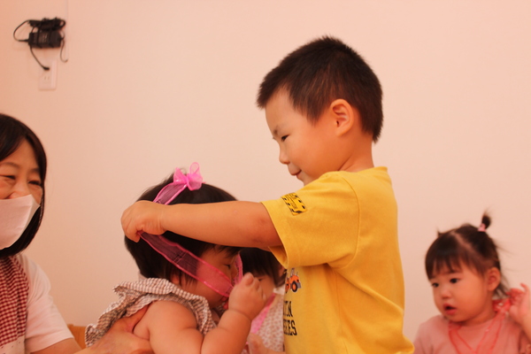 | お友達にペンダントをかけてもらったり、担当さんの楽しいマジックシアターを見たり、楽しい時間をみんなで過ごすことができましたよ。 | ||