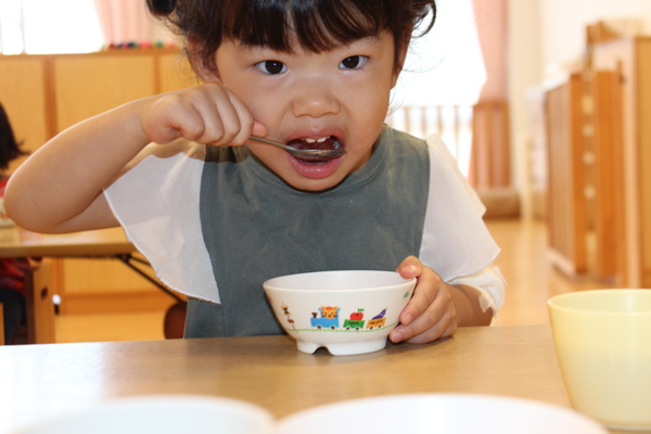 | 9月1日は防災の日。今日は、台風15号が東海地方を通り過ぎ、防災の週にタイムリーな給食メニューになりました。一杯の汁物の中にいろんな具材が入り、栄養満点のすいとんです。脱脂粉乳の入った小麦粉団子が柔らかく煮て入っていましたよ。おいしく頂きました。警報が発令されずに過ぎ去ってくれた、台風でしたね。まずは一安心です。そして3時のおやつはさっぱりヨーグルトです。 | ||