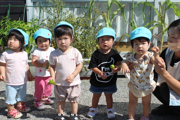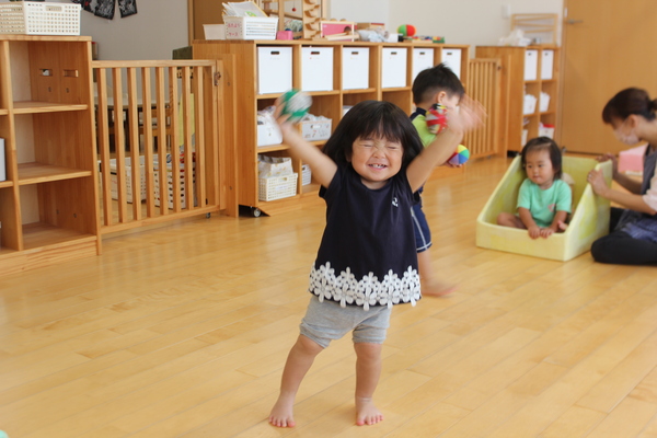 | 今日の主役です。今日の主役は0歳児のワタシ。「おはよう」 朝、機嫌よくママと登園してきました。しばらくママとお別れね。ママいってらっしゃーい。絵本の好きなワタシは絵本コーナーでお気に入りの絵本を持ってきます。今日は「ももんちゃん しー」の絵本なの?あら、ももんちゃんと一緒に「しー」しているのね。手を洗ったら、おやつですよー。小さなお菓子も上手につまんで食べられます。おやつの後はみんな集まって、朝の会。今日はお兄さんお姉さんたちはもうお出かけしたから、0歳さんだけで、歌を歌います。なんていい笑顔。楽しそうね。 | ||